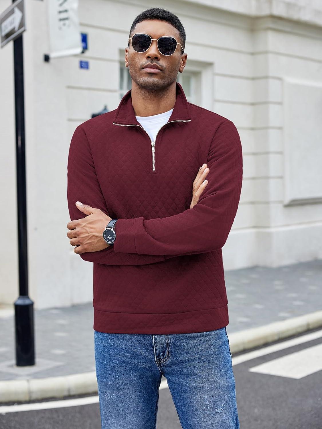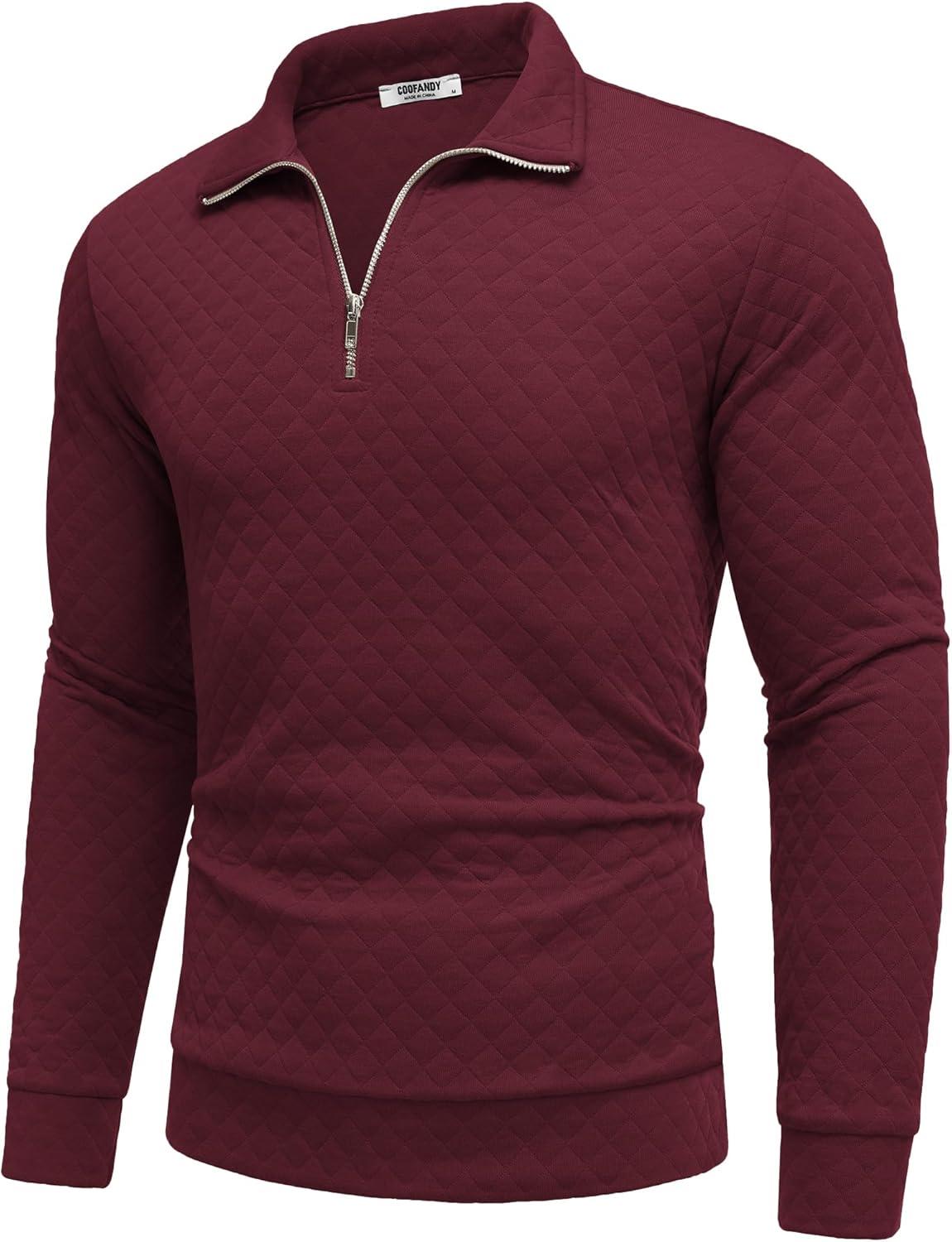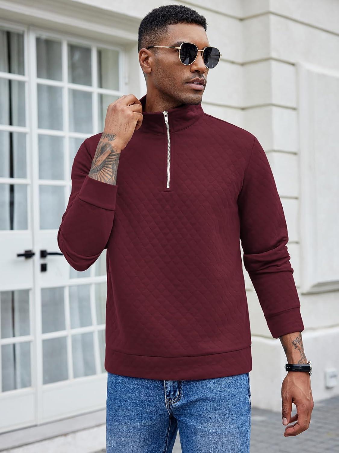 COOFANDY Men's Fashion Quarter Zip Pullover Long Sleeve Quilted Sweatshirt Plaid Jacquard Polo Mock Neck Sweaters(Wine Red)