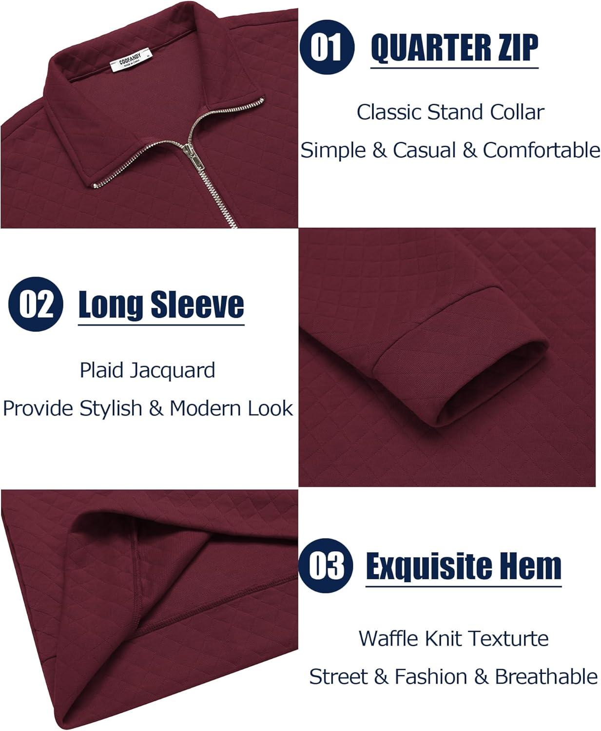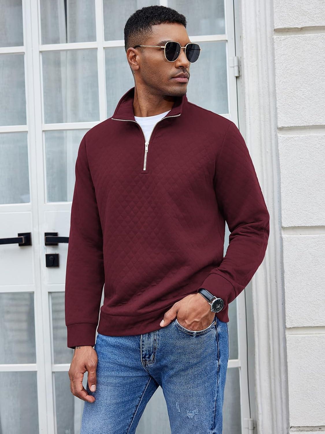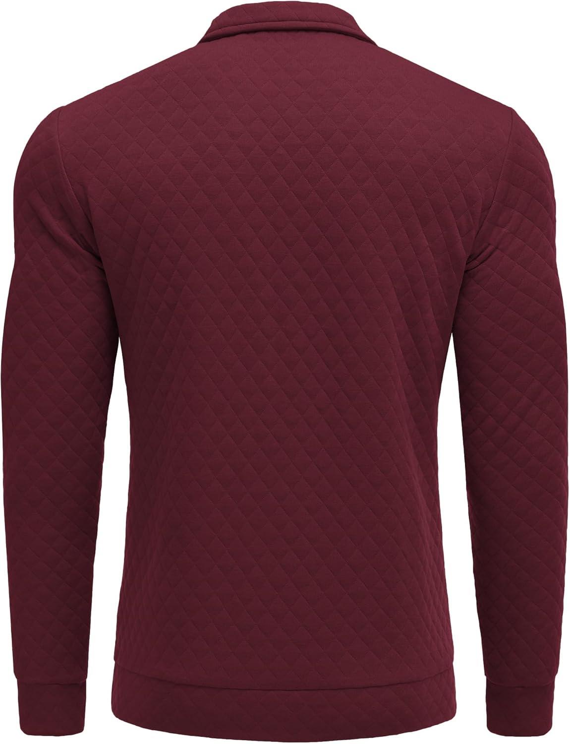 COOFANDY Men's Fashion Quarter Zip Pullover Long Sleeve Quilted Sweatshirt Plaid Jacquard Polo Mock Neck Sweaters(Wine Red)