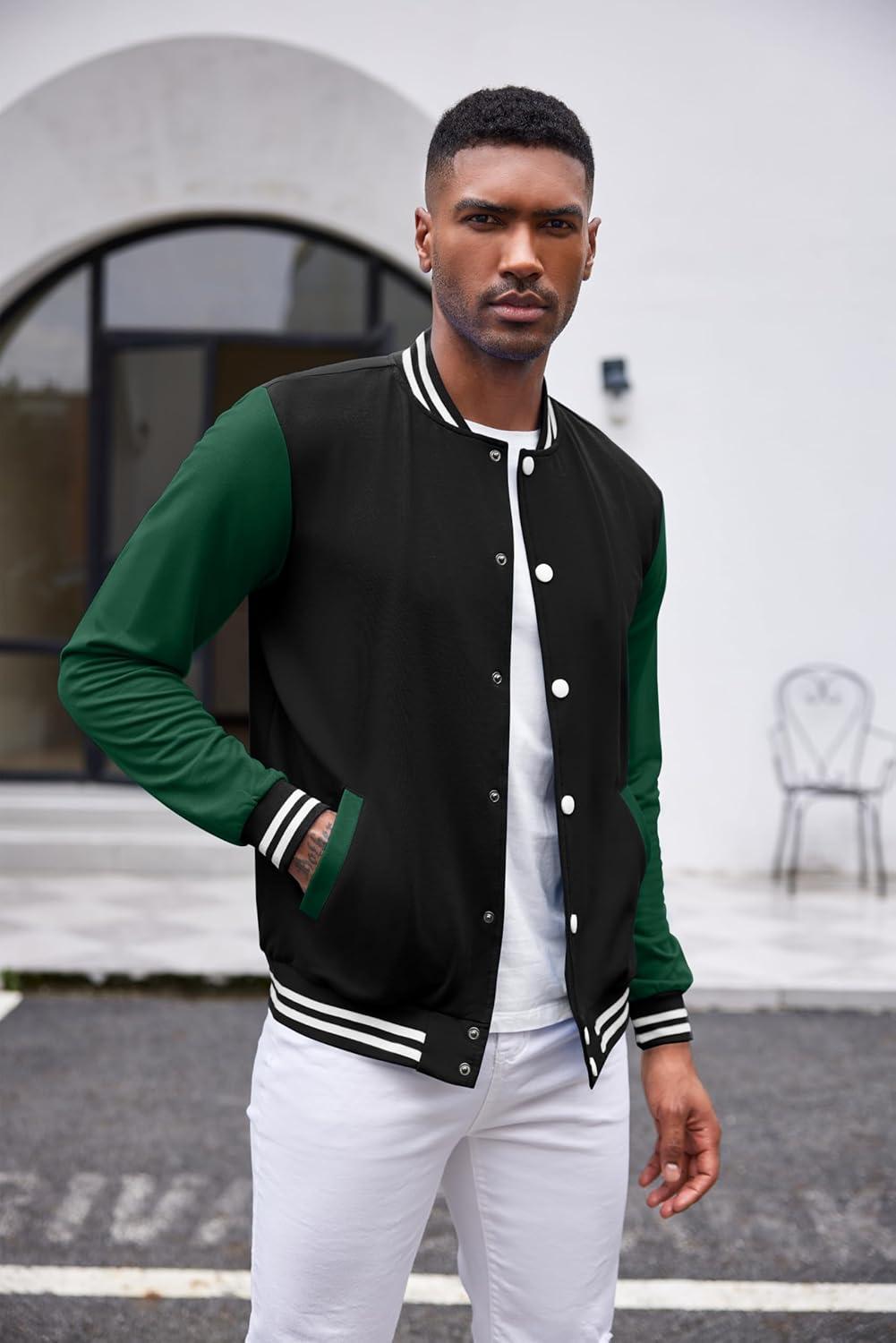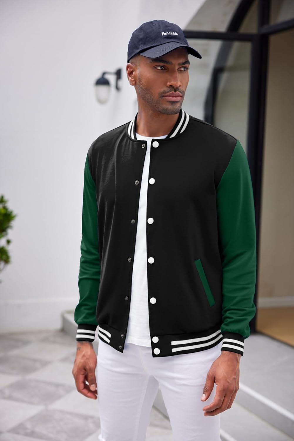 COOFANDY Men's Fashion Varsity Jacket Causal Slim Fit Cotton Letterman Baseball Bomber Jackets(Black Green)