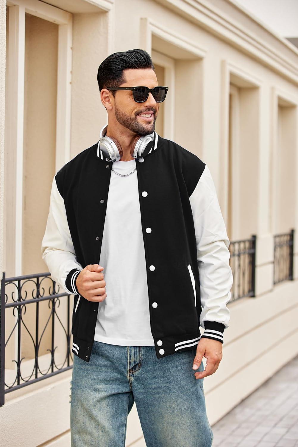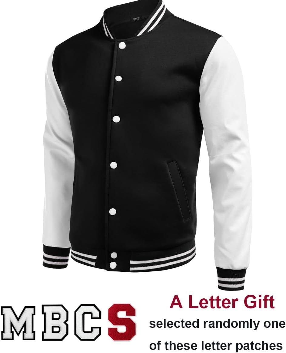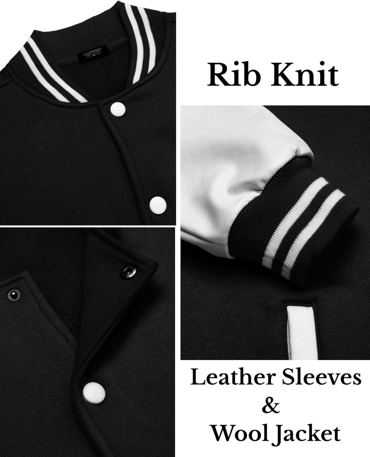 COOFANDY Mens Fashion Varsity Jackets Leather Sleeve Slim Fit College Baseball Letterman Bomber Coat(Black-white Sleeve)