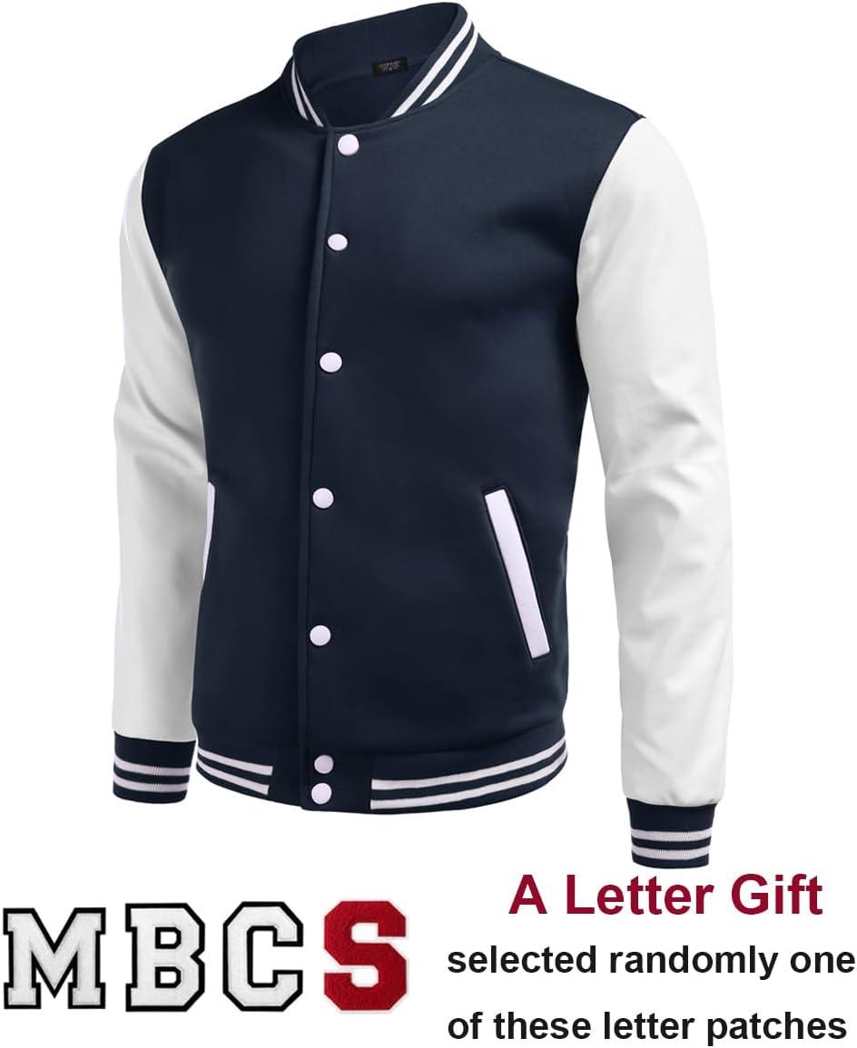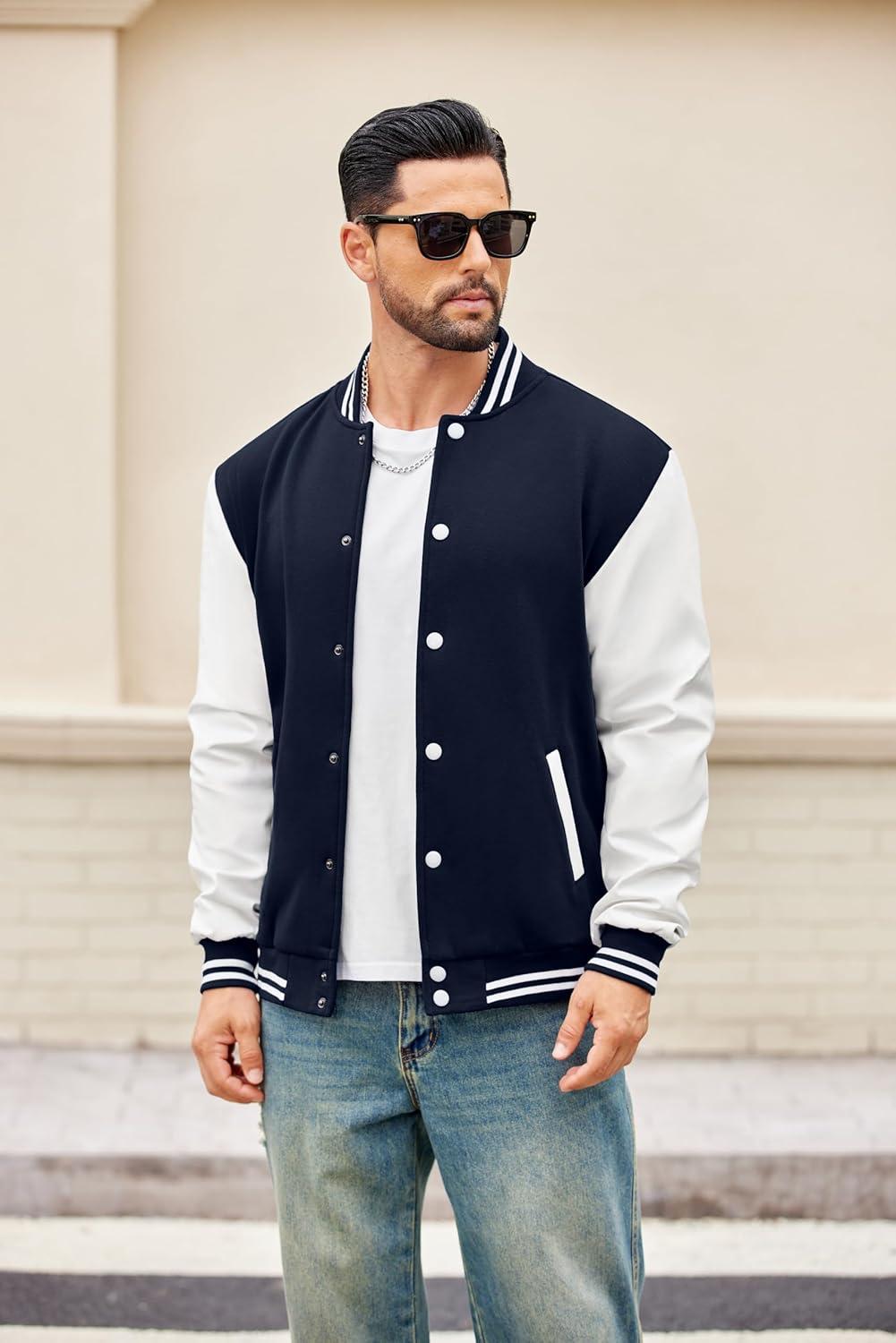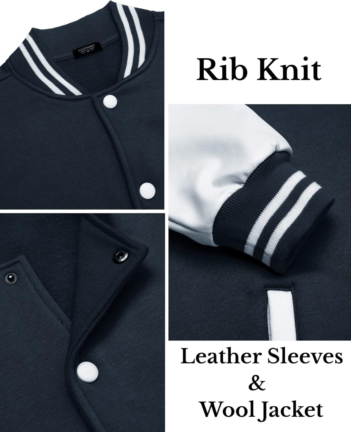 COOFANDY Mens Fashion Varsity Jackets Leather Sleeve Slim Fit College Baseball Letterman Bomber Coat(Navy-white Sleeve)