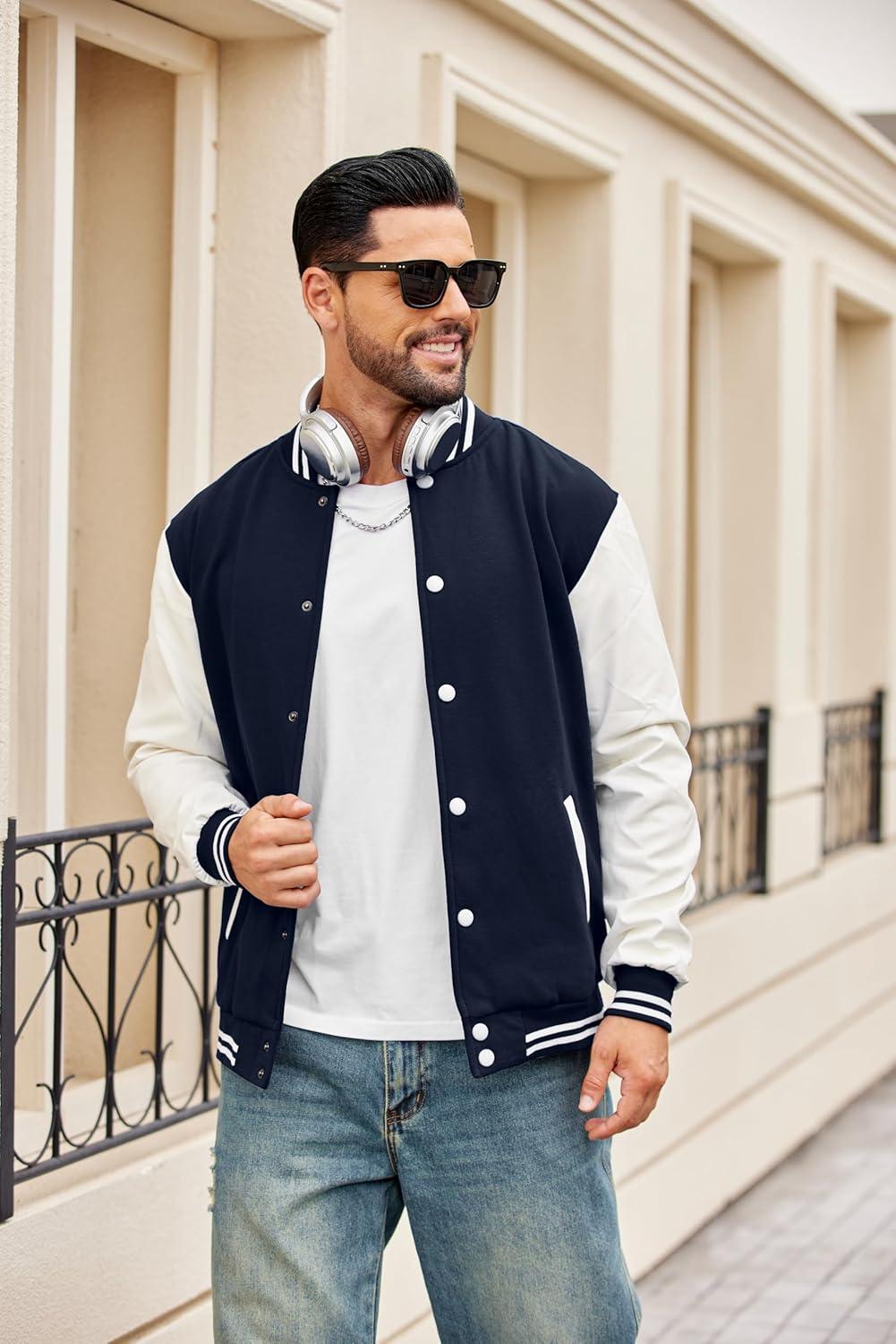 COOFANDY Mens Fashion Varsity Jackets Leather Sleeve Slim Fit College Baseball Letterman Bomber Coat(Navy-grey)