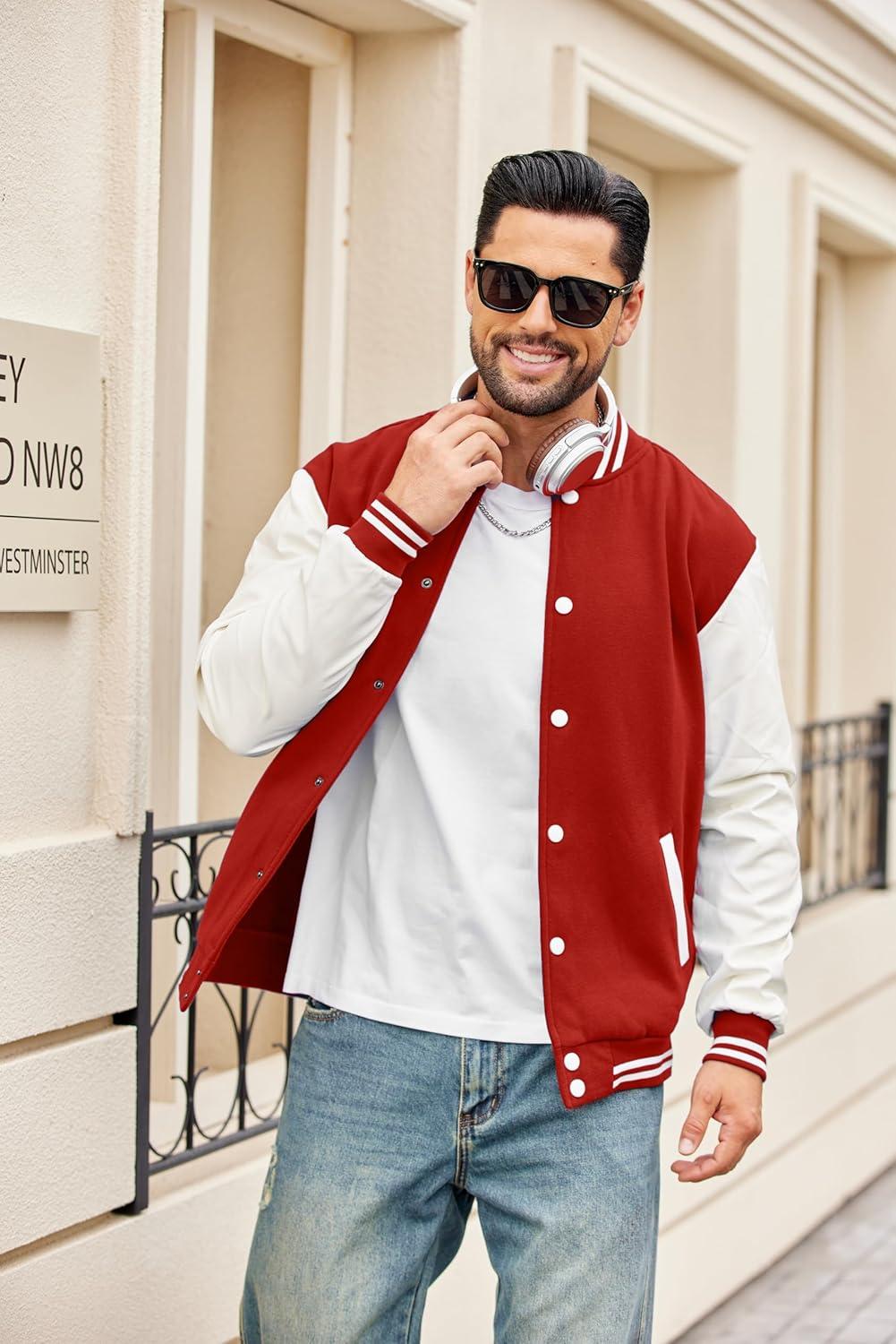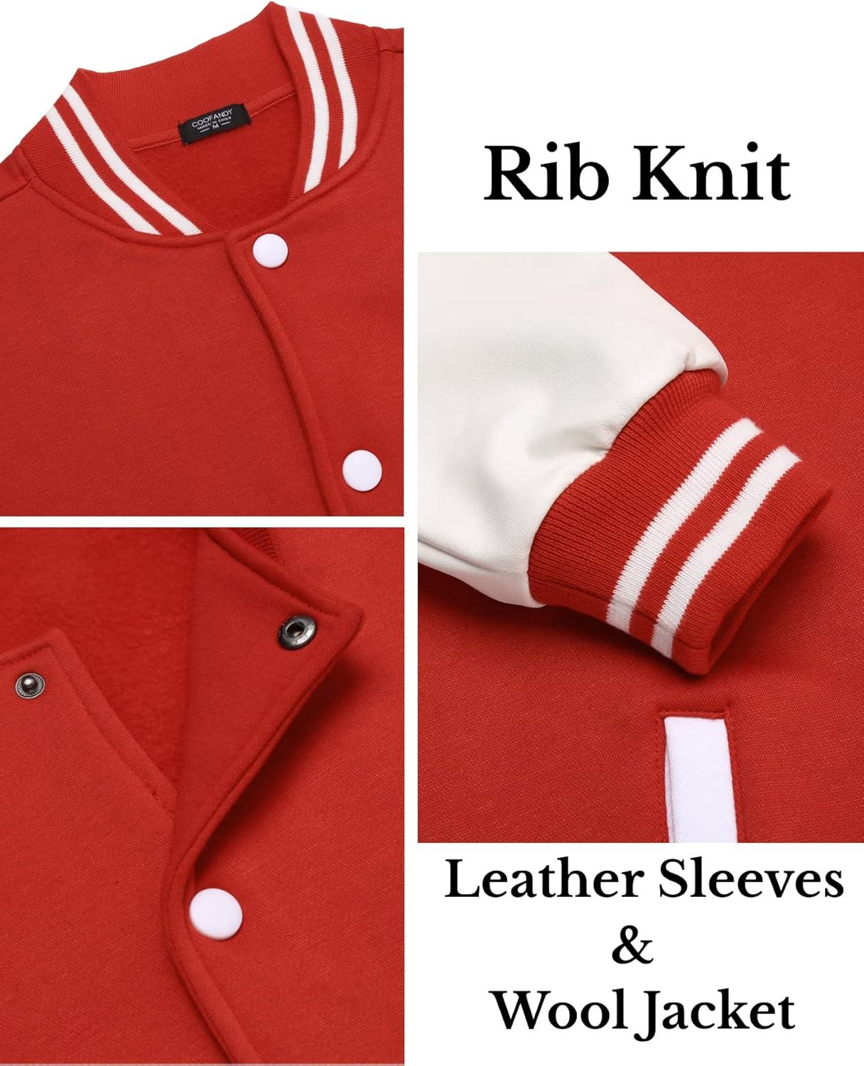COOFANDY Mens Fashion Varsity Jackets Leather Sleeve Slim Fit College Baseball Letterman Bomber Coat(Red-white Sleeve)