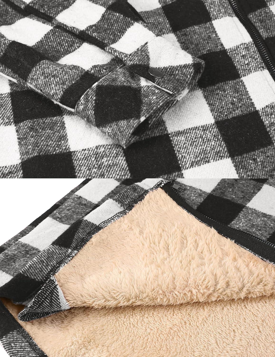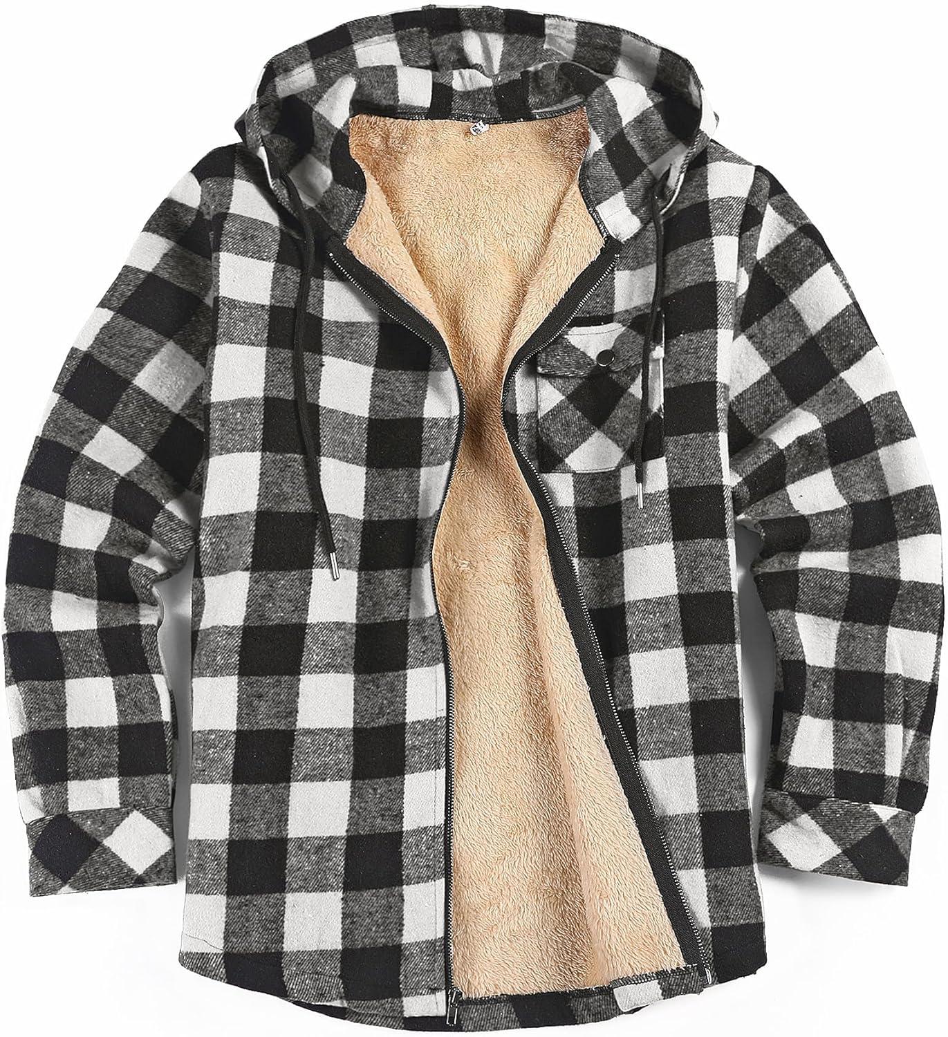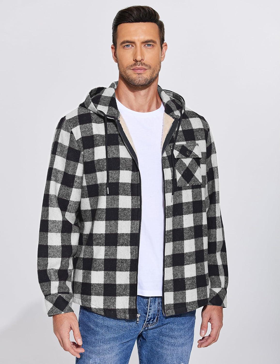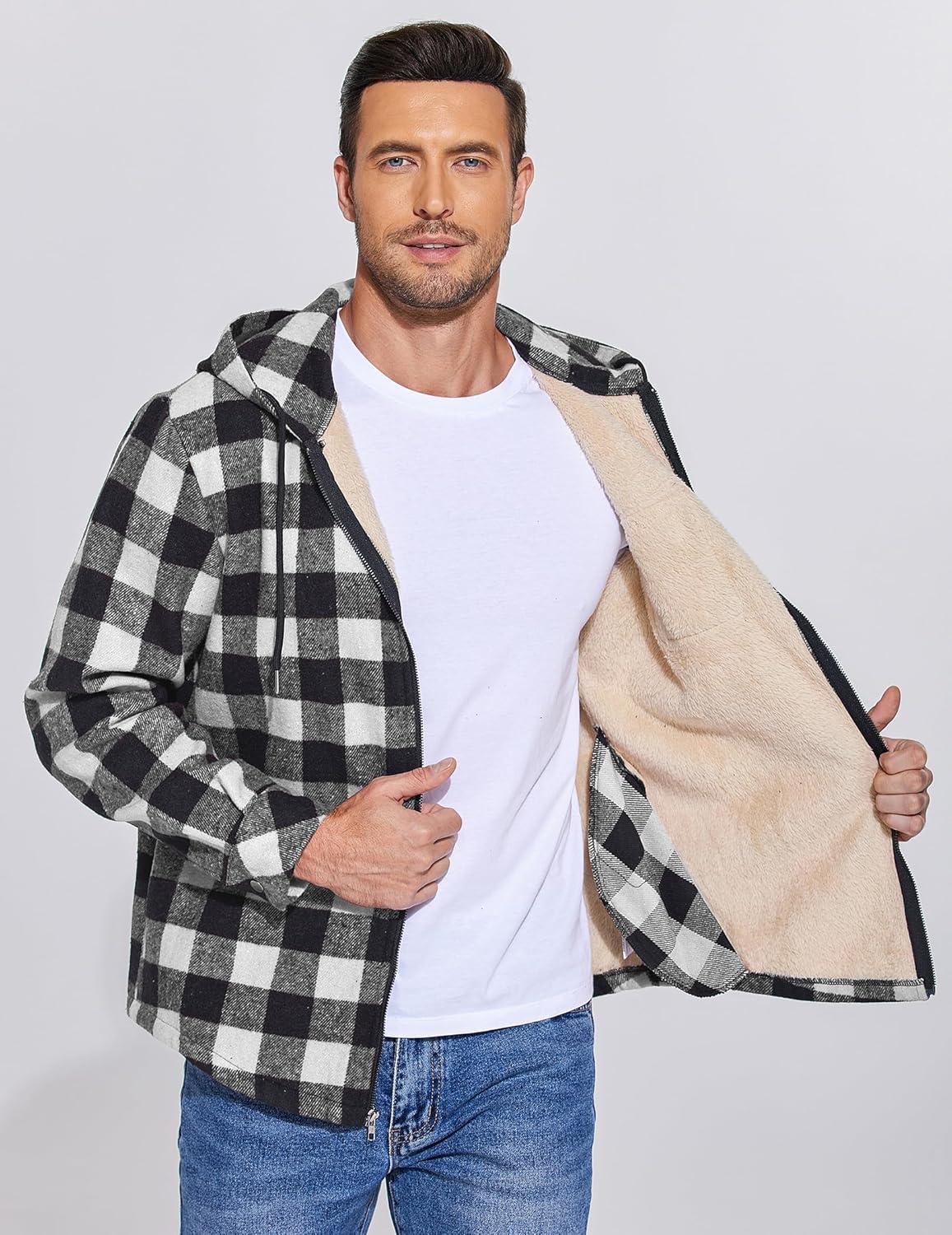 COOFANDY Men's Flannel Fleece Jacket Sherpa Lined Shirt Jacket Plaid Zip Up Hoodie Soft Warm Coat with Hood(B-black Plaid)