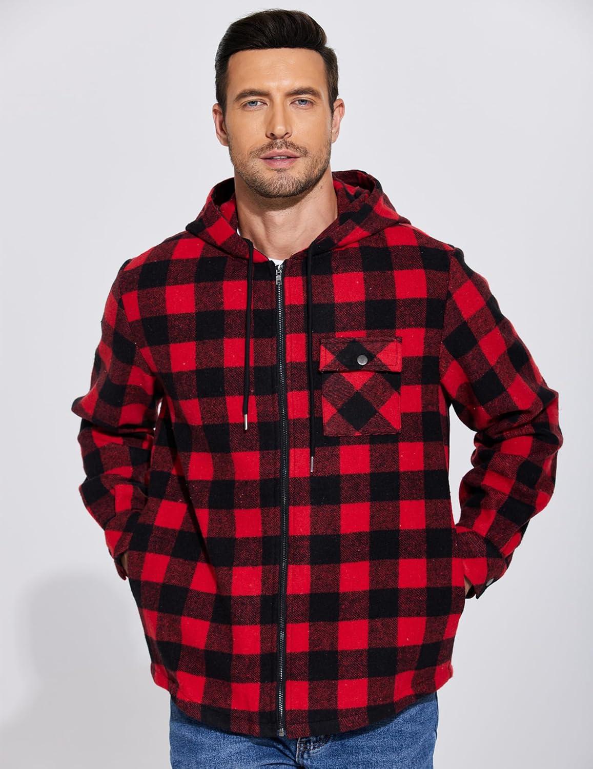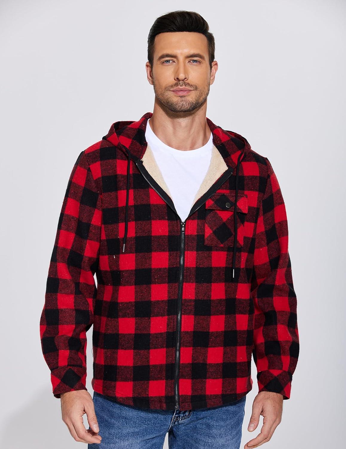 COOFANDY Men's Flannel Fleece Jacket Sherpa Lined Shirt Jacket Plaid Zip Up Hoodie Soft Warm Coat with Hood(B-red Plaid)