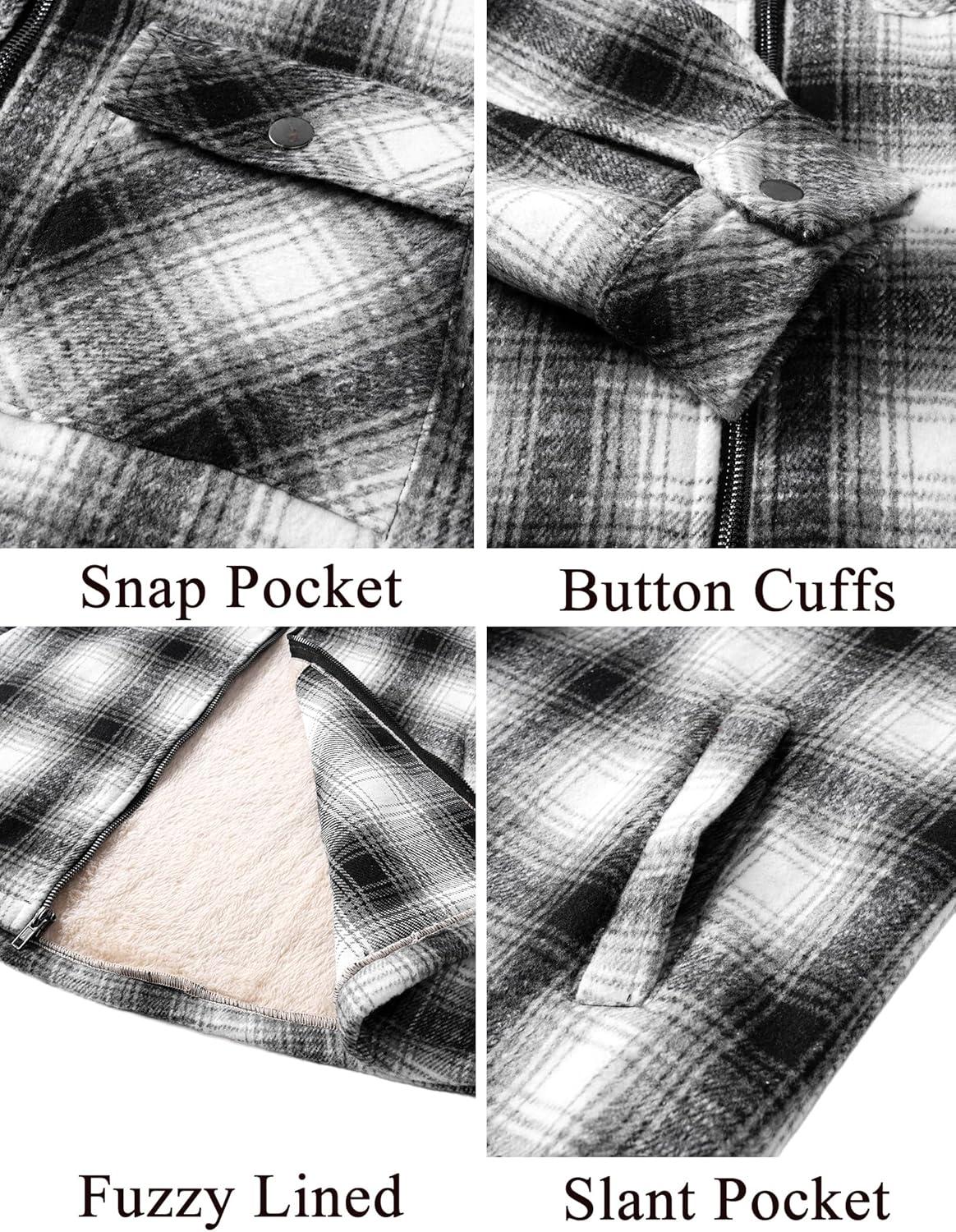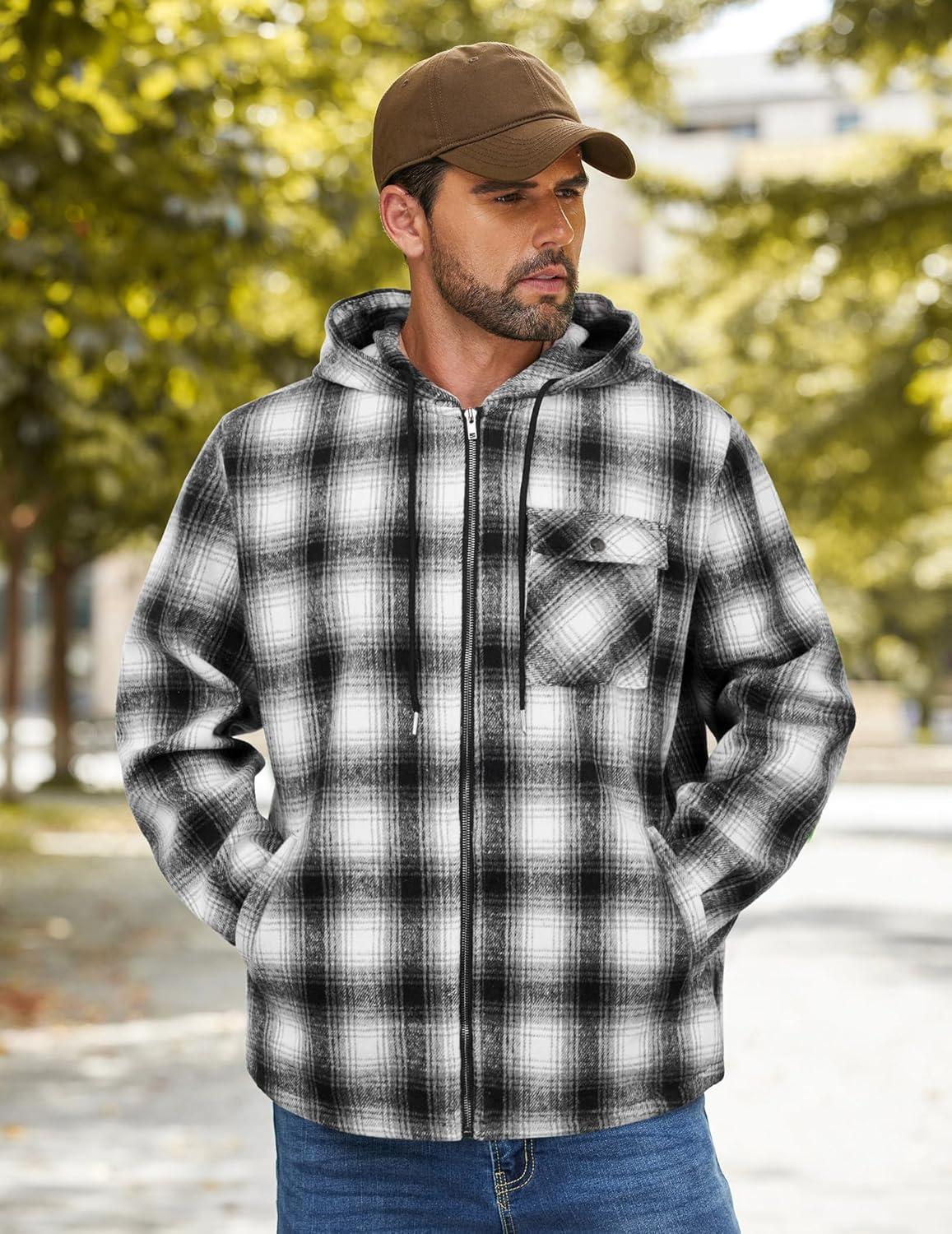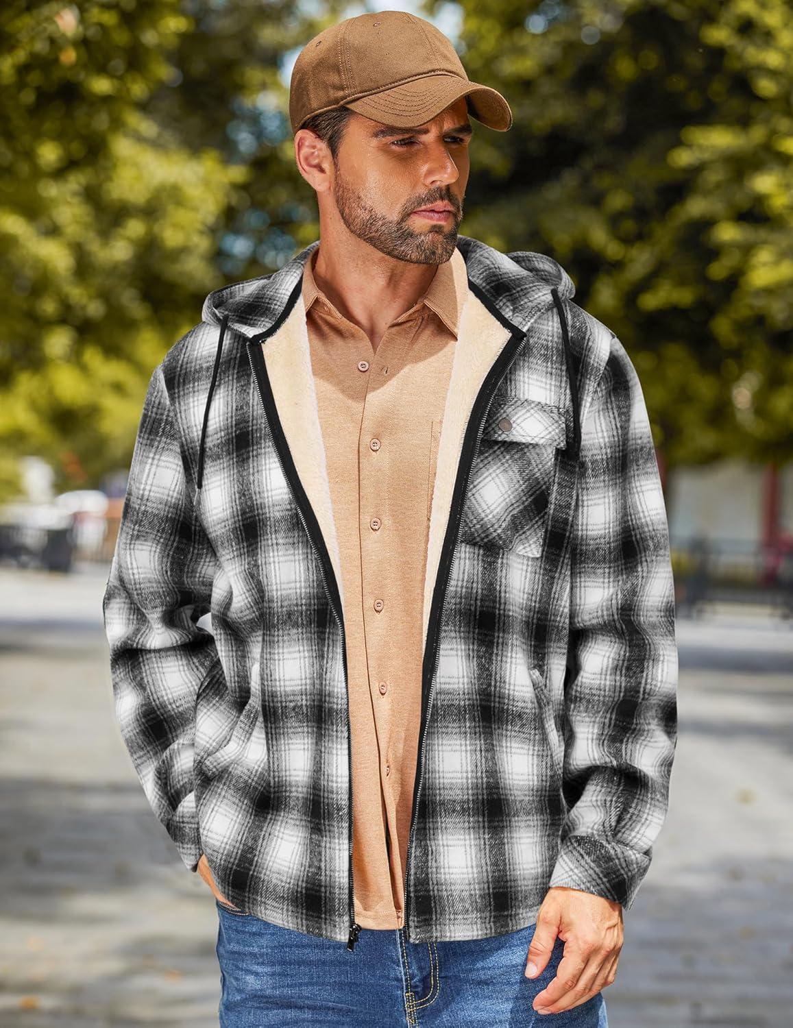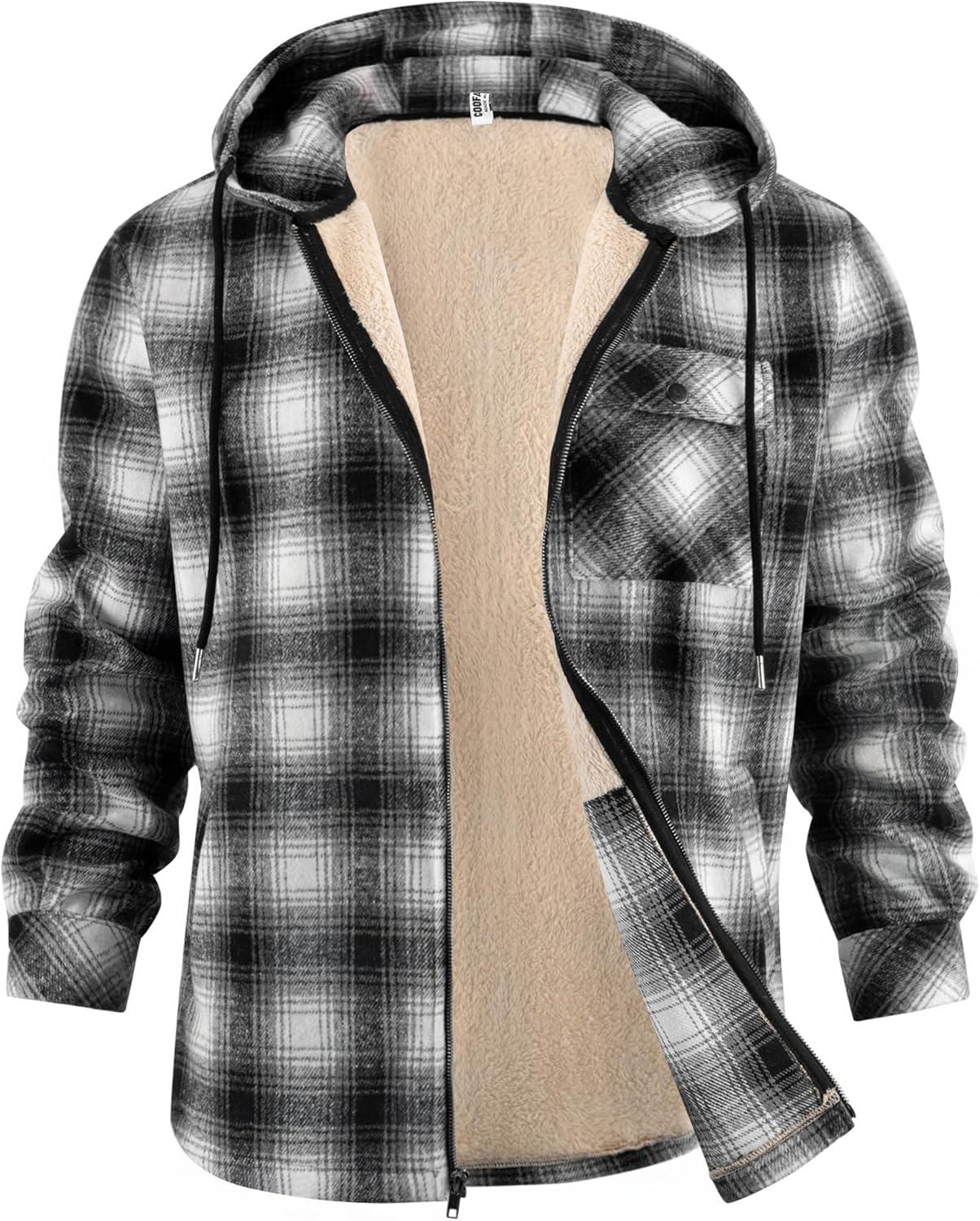 COOFANDY Men’s Flannel Fleece Jacket Sherpa Lined Shirt Jacket Plaid Zip Up Hoodie Soft Warm Coat with Hood(B-black Plaid)