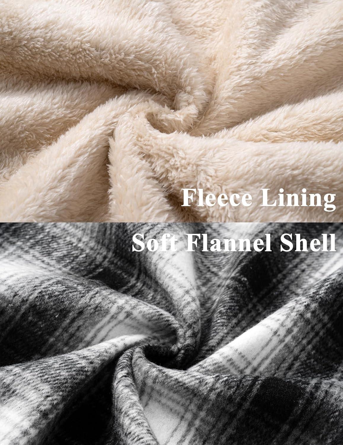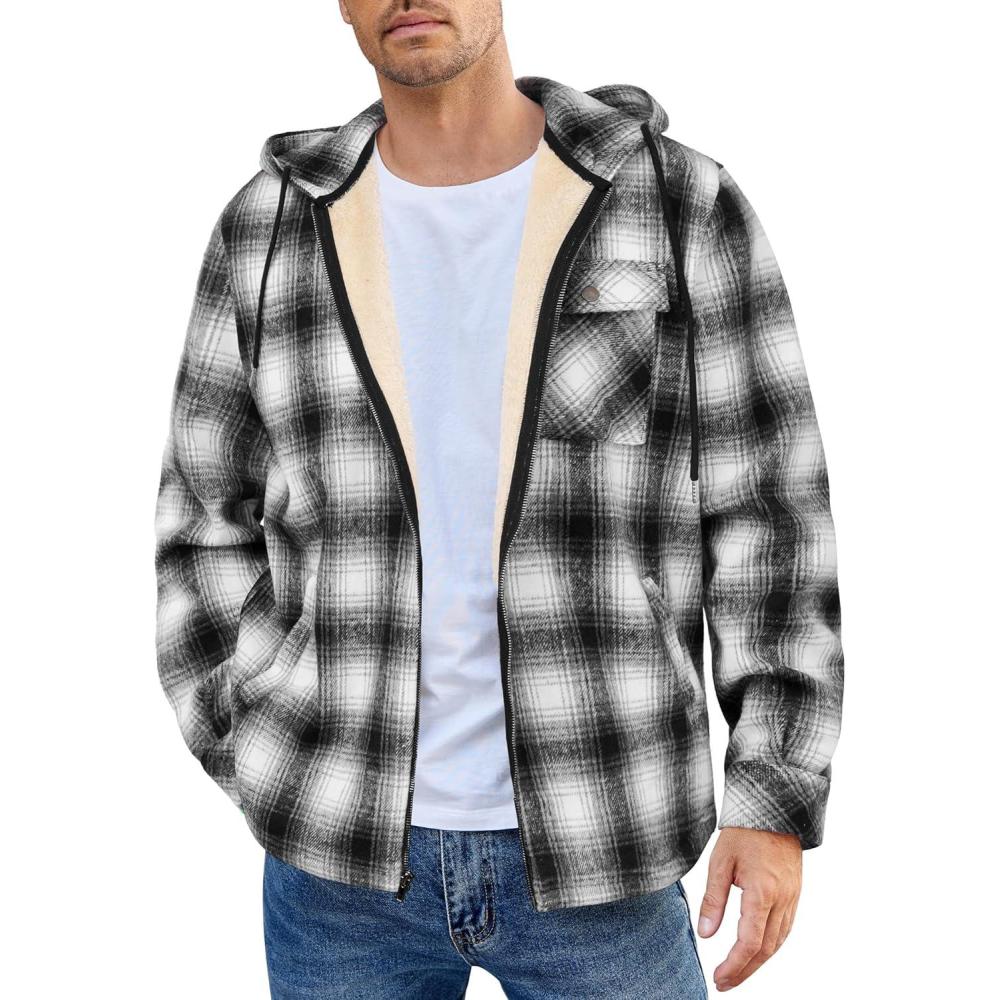 COOFANDY Men's Flannel Fleece Jacket Sherpa Lined Shirt Jacket Plaid Zip Up Hoodie Soft Warm Coat with Hood(G-black White Line)