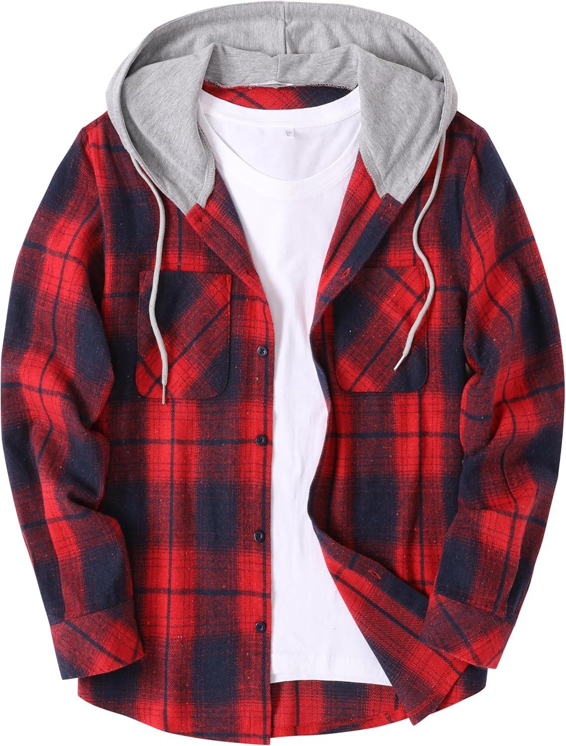 COOFANDY Men's Flannel Hoodie Plaid Shirt Long Sleeve Button Down Casual Shirt Jacket Lightweight Fall Shacket(Plaid-red & Blue)