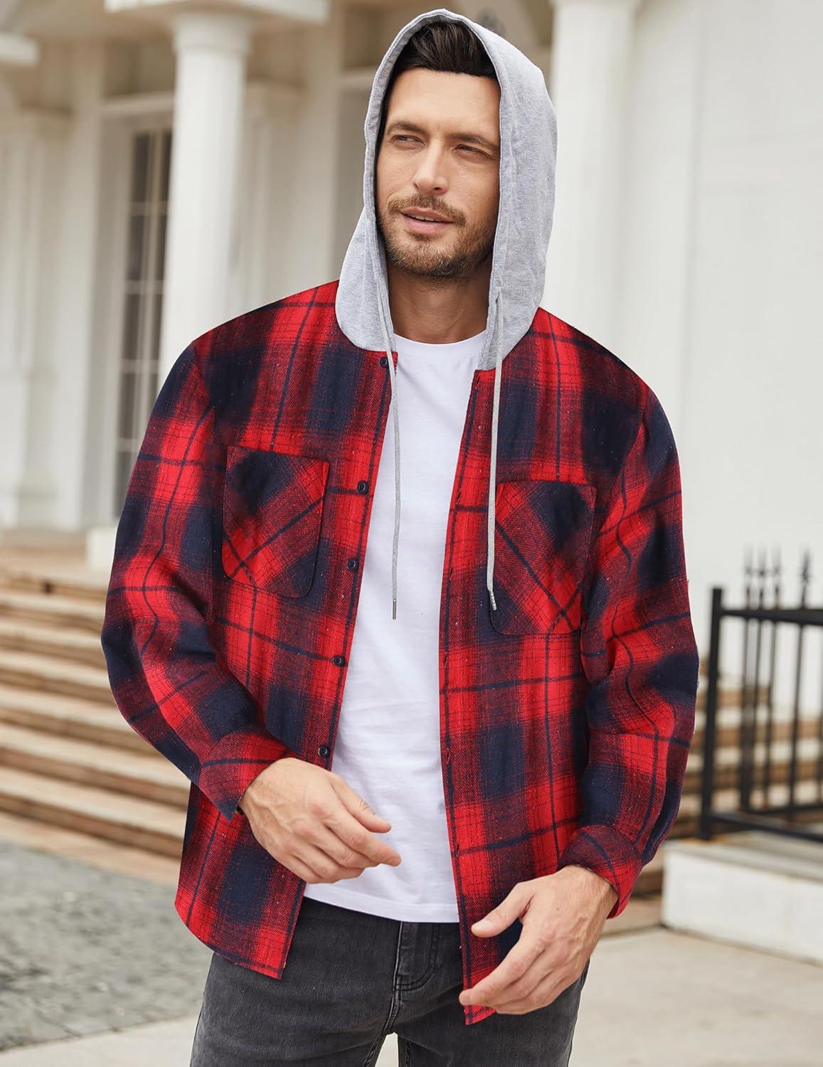 COOFANDY Men’s Flannel Hoodie Plaid Shirt Long Sleeve Button Down Casual Shirt Jacket Lightweight Fall Shacket(Plaid-red & Blue)