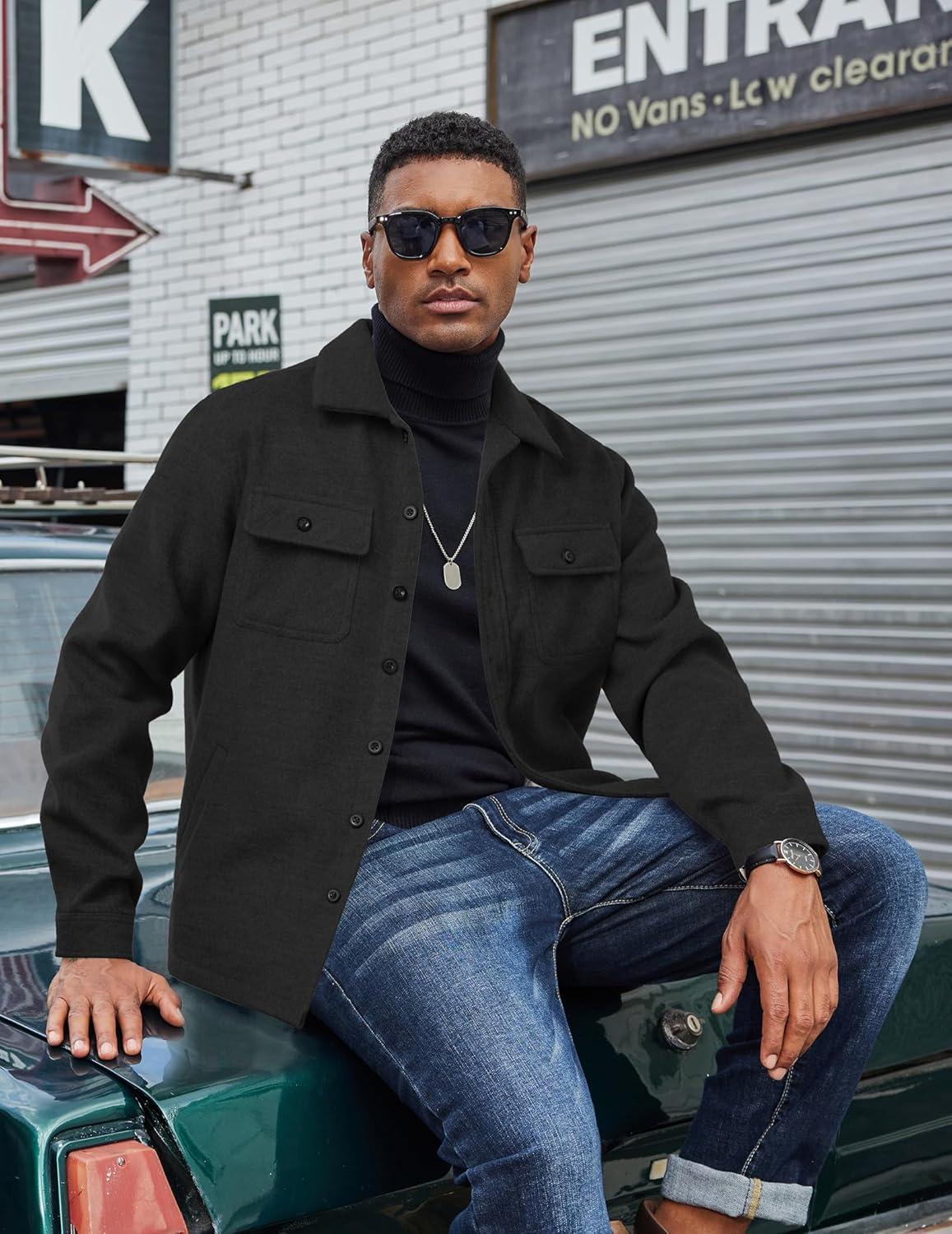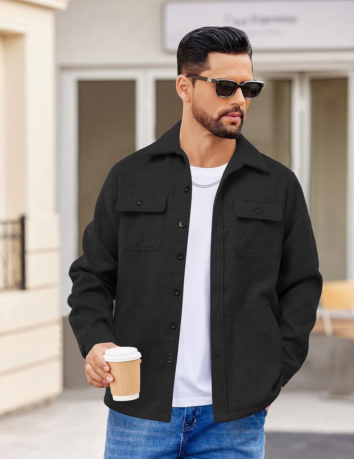 COOFANDY Men's Flannel Jacket Long Sleeve Plaid Shirt Jackets Button Down Fleece Shacket Casual Fall Soft Outwear(Pure Black)