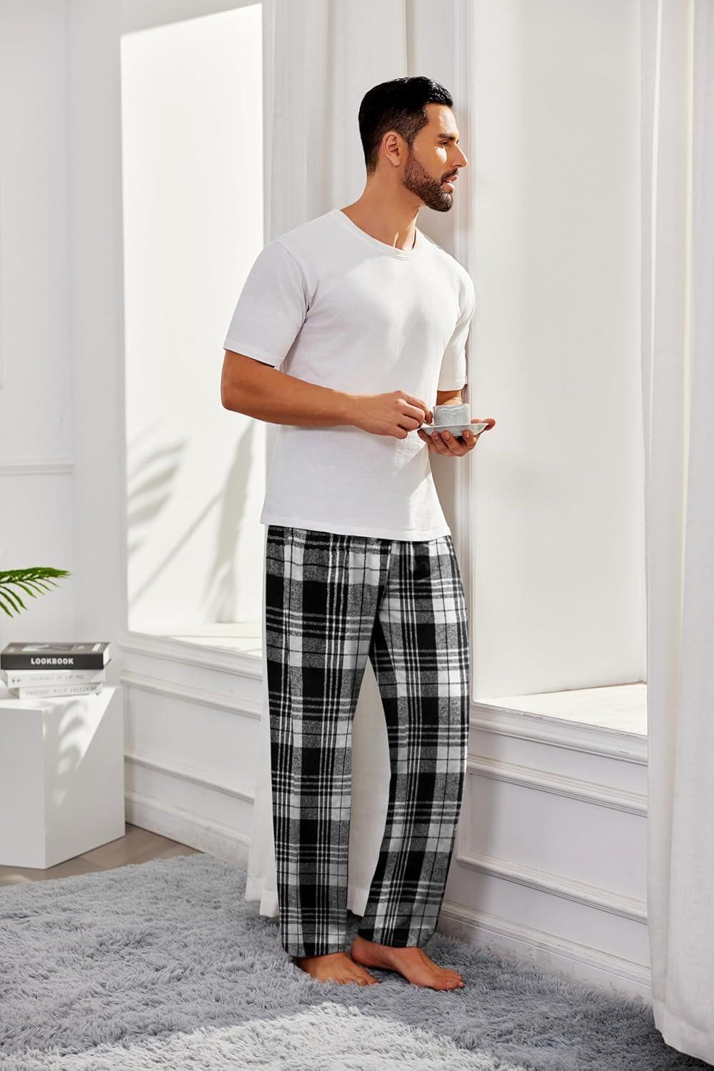 COOFANDY Men's Flannel Plaid Pants Drawstring Cotton Casual Lounge Pants with Pockets(Black White Tartan)