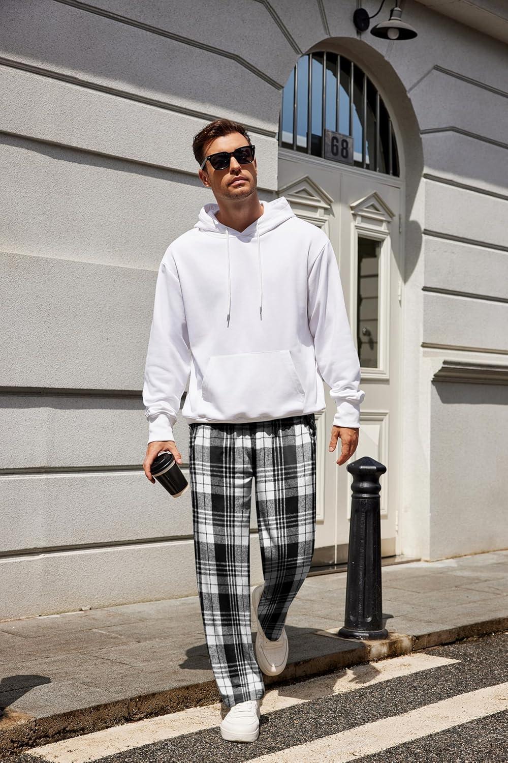 COOFANDY Men’s Flannel Plaid Pants Drawstring Cotton Casual Lounge Pants with Pockets(Black White Tartan)