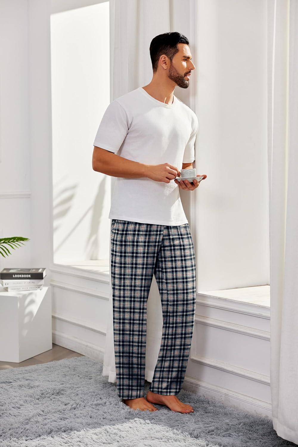 COOFANDY Men's Flannel Plaid Pants Drawstring Cotton Casual Lounge Pants with Pockets(Navy Black White Plaid)