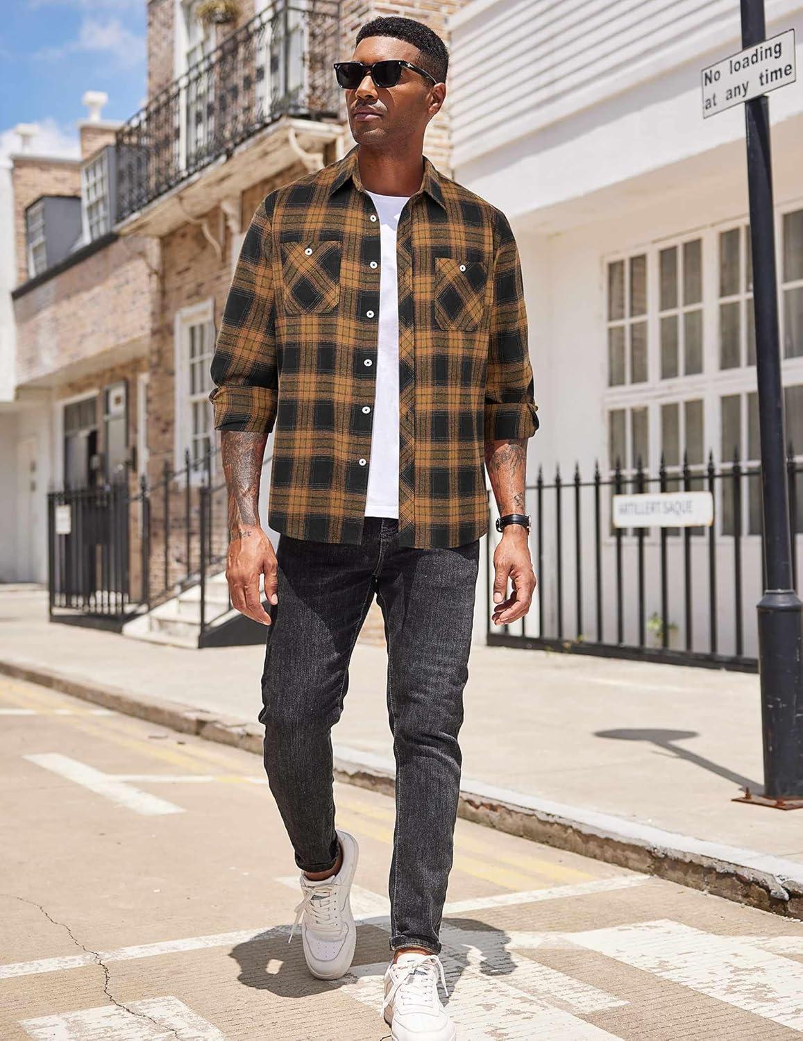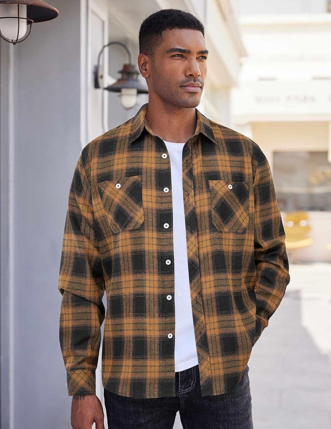 COOFANDY Men’s Flannel Plaid Shirts Long Sleeve Casual Button Down Shirt with Pockets(Black Brown)
