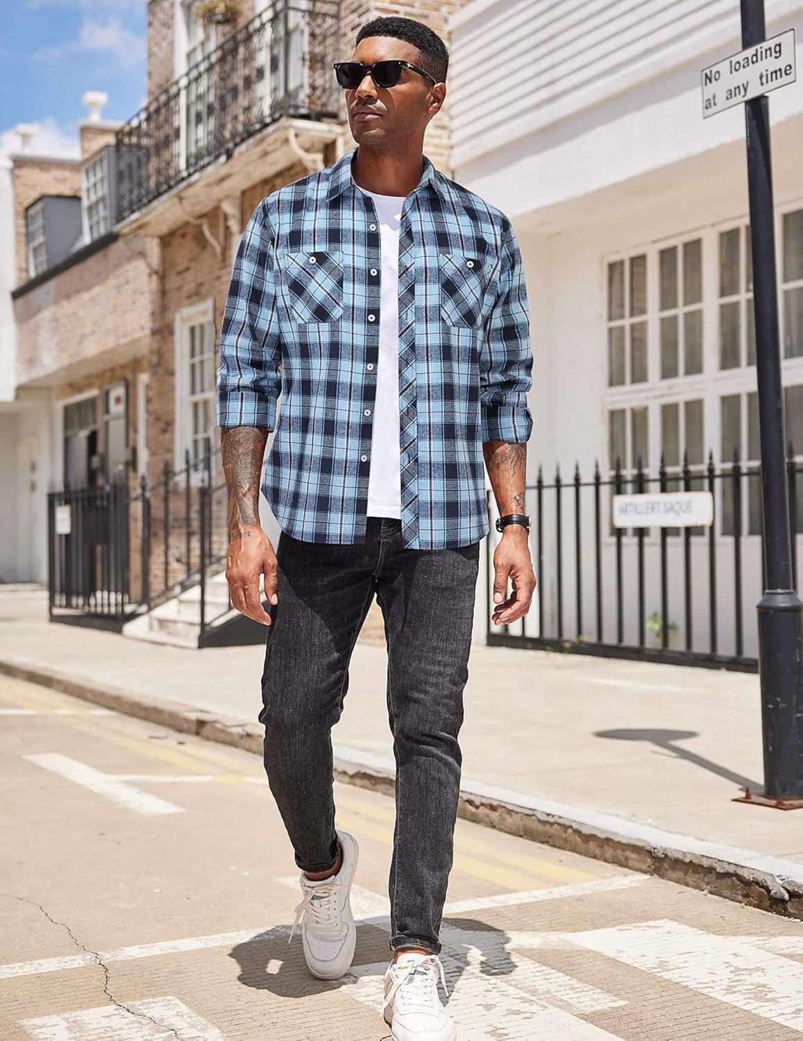 COOFANDY Men’s Flannel Plaid Shirts Long Sleeve Casual Button Down Shirt with Pockets(Blue Black Plaid)