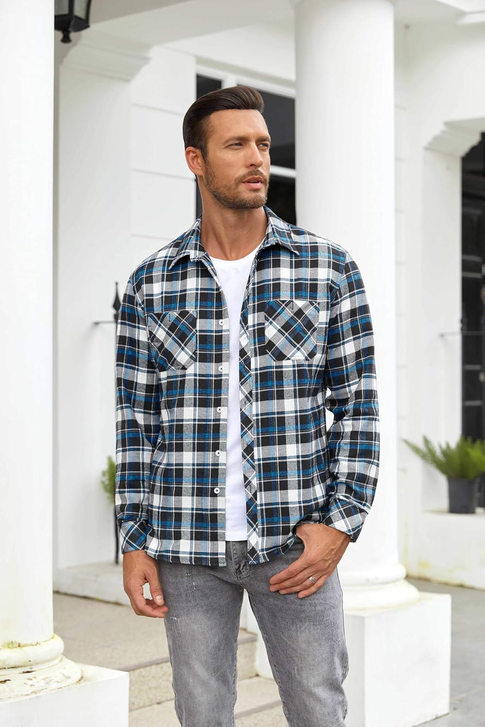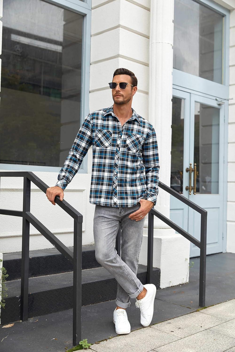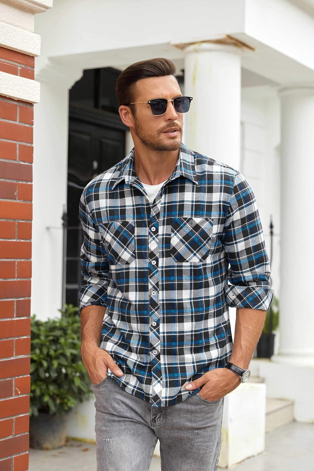 COOFANDY Men's Flannel Plaid Shirts Long Sleeve Casual Button Down Shirt with Pockets(Blue White)