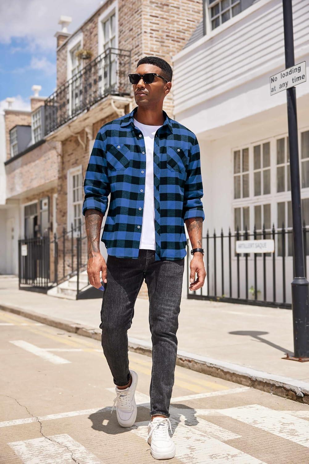 COOFANDY Men’s Flannel Plaid Shirts Long Sleeve Casual Button Down Shirt with Pockets(Blue)