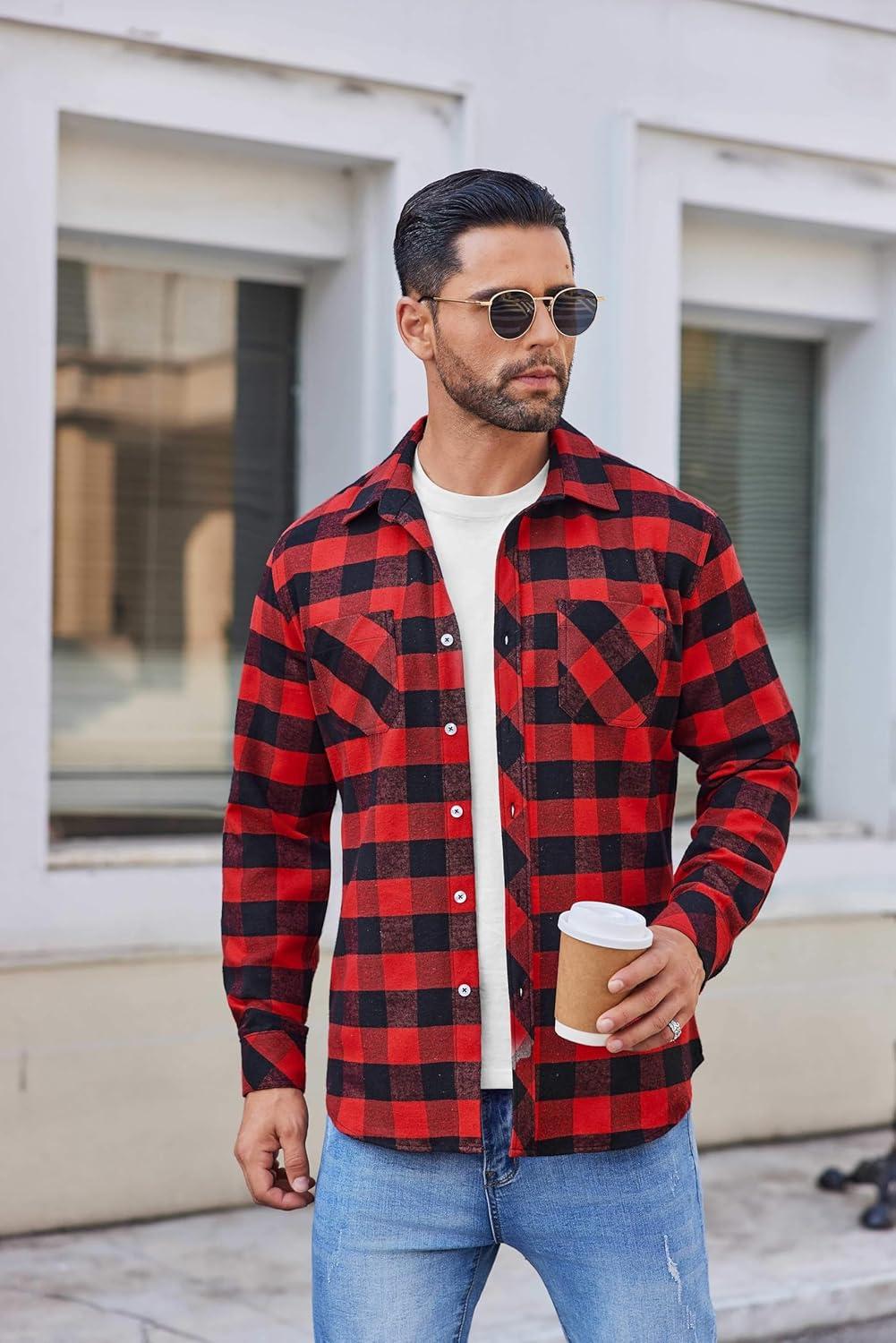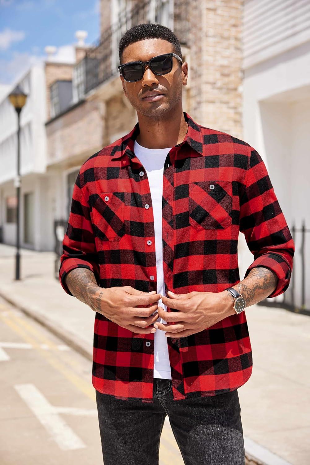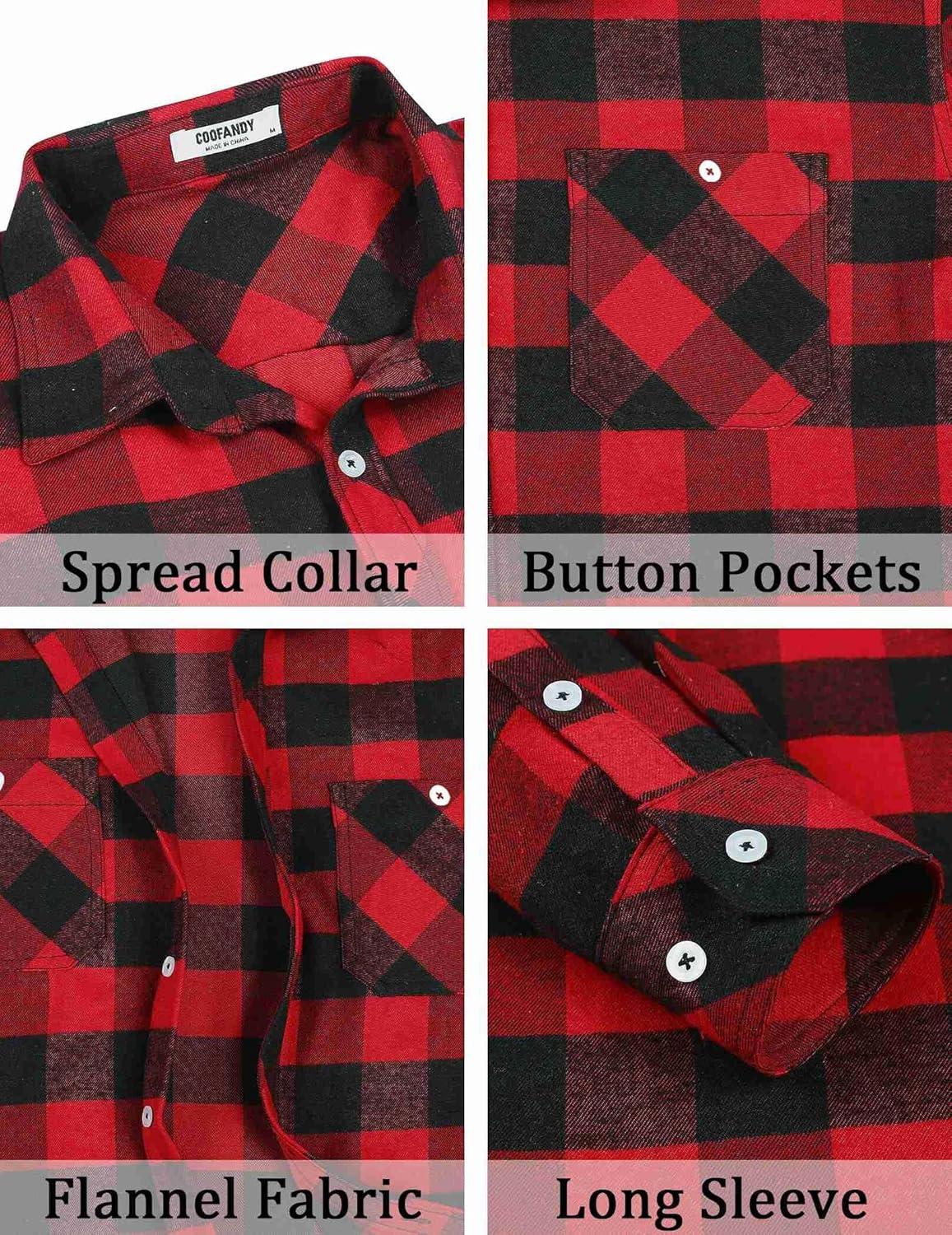 COOFANDY Men's Flannel Plaid Shirts Long Sleeve Casual Button Down Shirt with Pockets(Red)