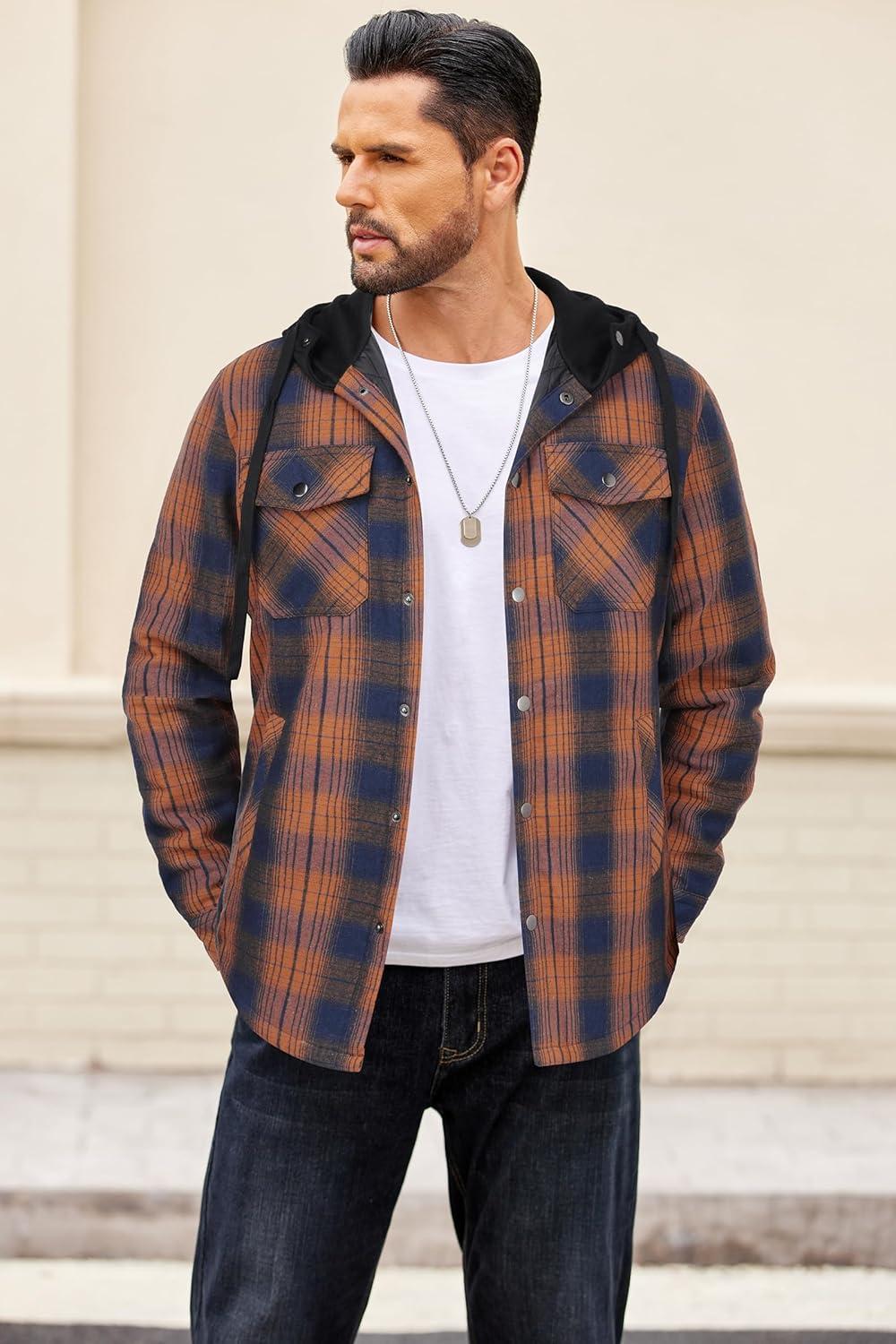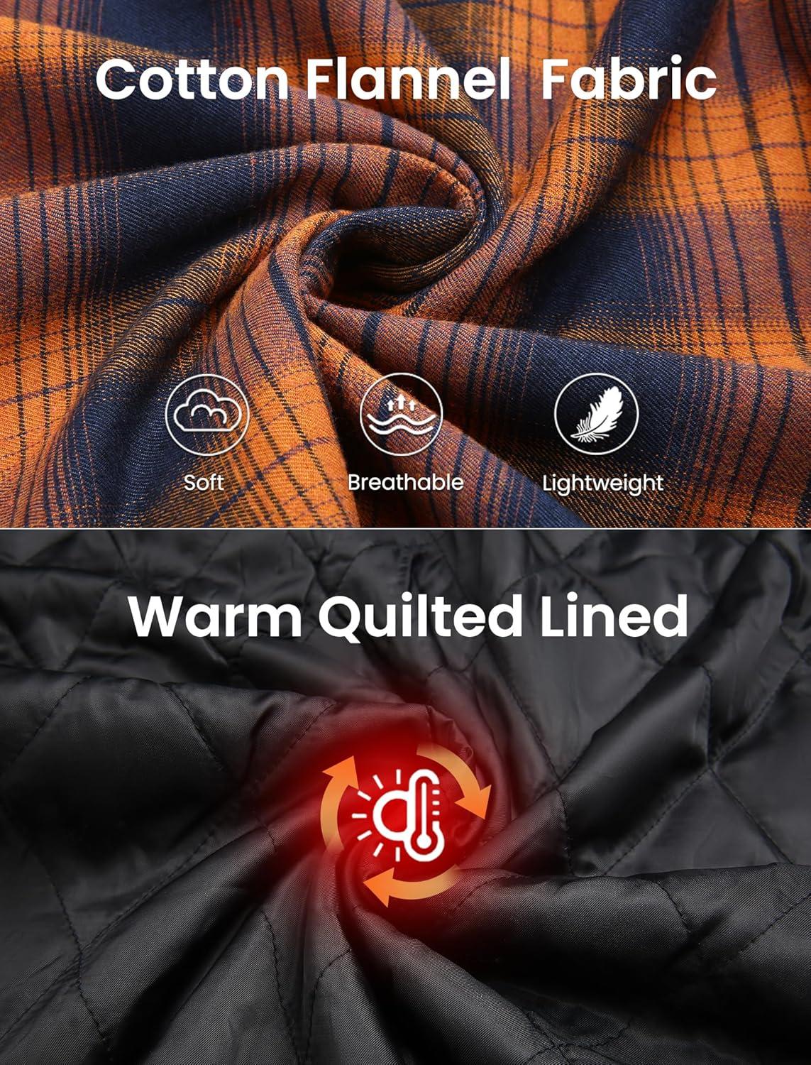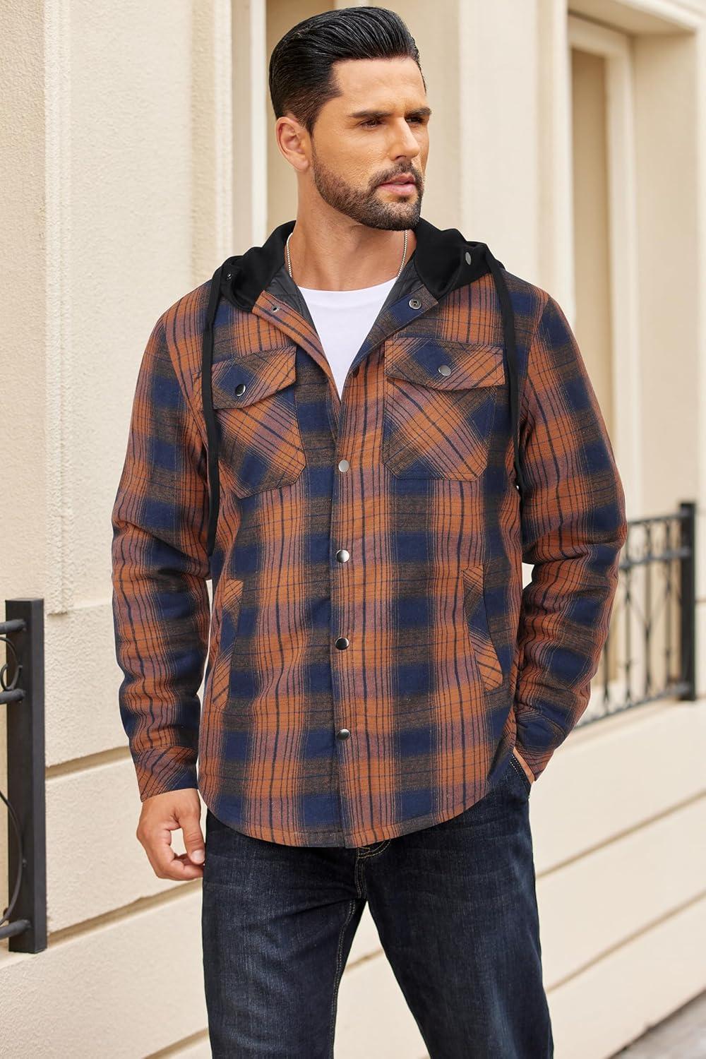 COOFANDY Mens Flannel Shirt Jacket Cotton Quilted Lined Plaid Shirt Long Sleeve Button Down Hoodie Jackets(Navy Brown Plaid)
