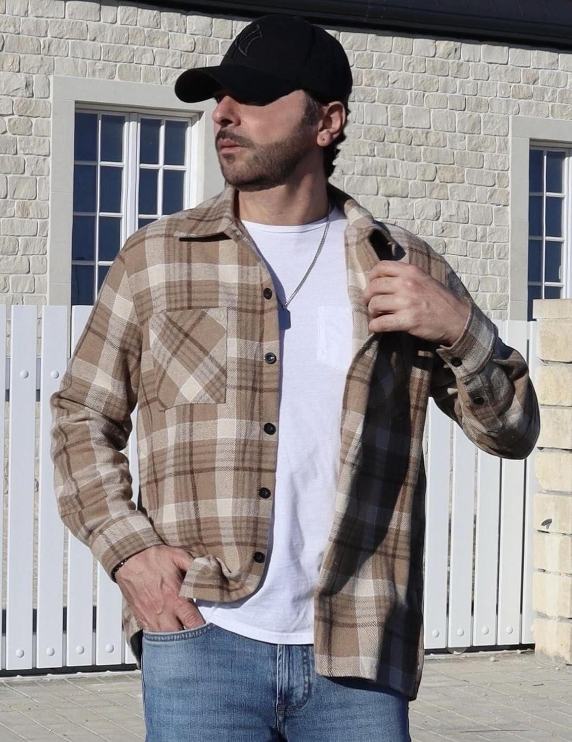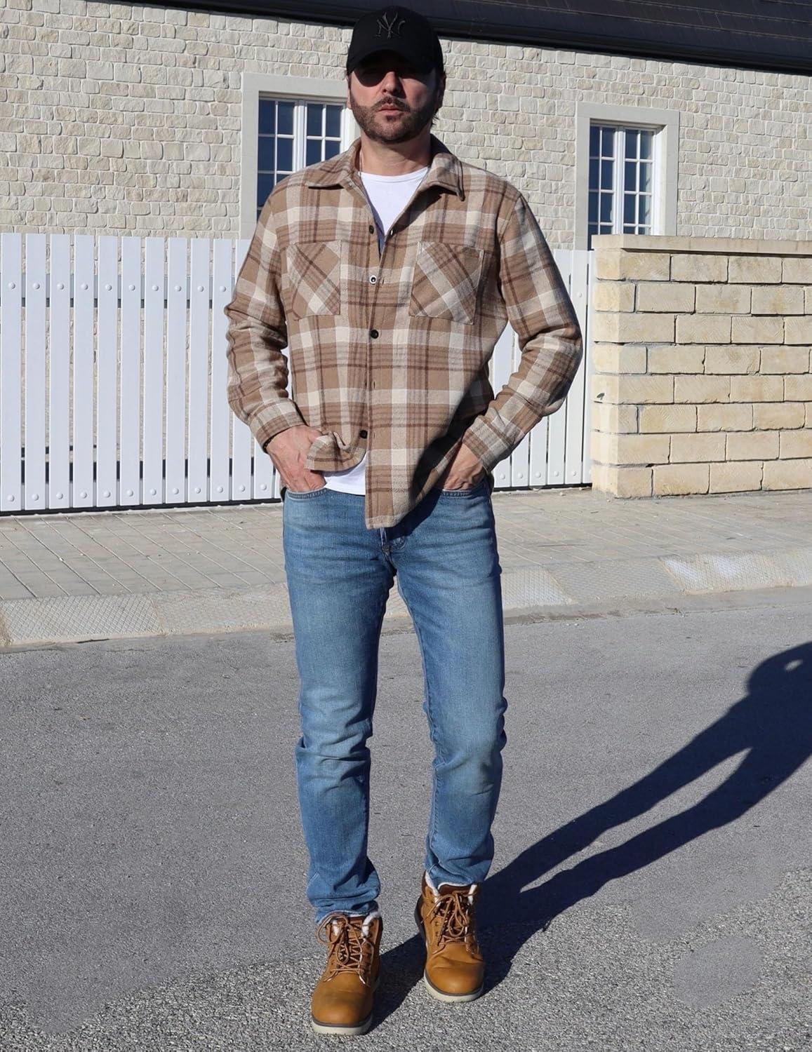 COOFANDY Men’s Flannel Shirts Casual Button Down Plaid Shirt Jacket Long Sleeve Fleece Shacket with Pockets(Khaki)
