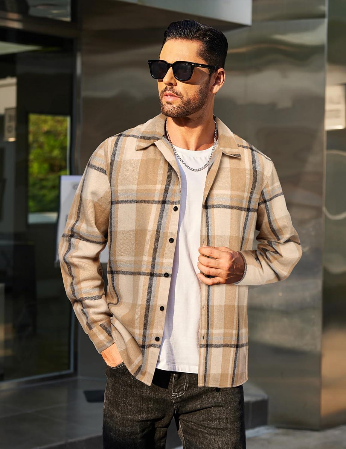COOFANDY Men’s Flannel Shirts Casual Button Down Plaid Shirt Jacket Long Sleeve Fleece Shacket(Khaki&beige Plaid)