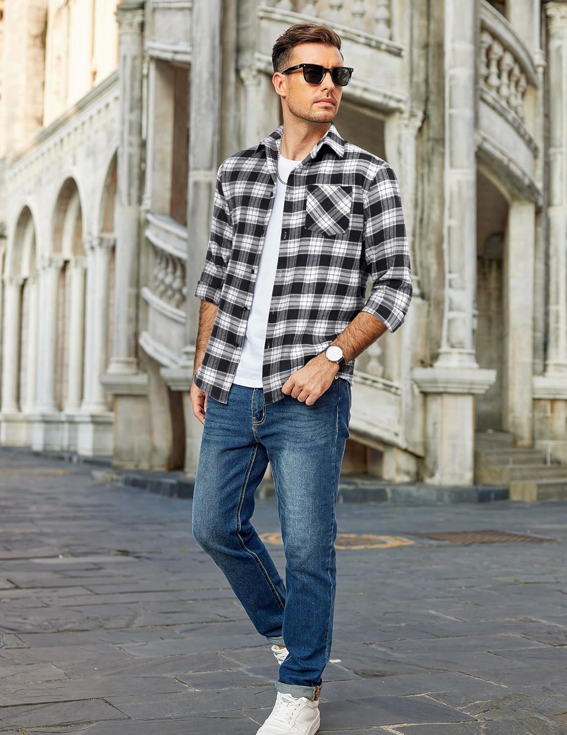 COOFANDY Men’s Flannel Shirts Long Sleeve Button Down Plaid Shirt Lightweight Shirt Jacket(Black & White)