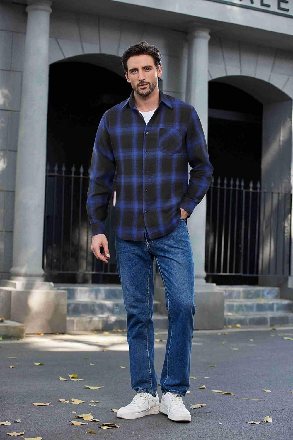 COOFANDY Men's Flannel Shirts Long Sleeve Button Down Plaid Shirt Lightweight Shirt Jacket(Blue & Black)