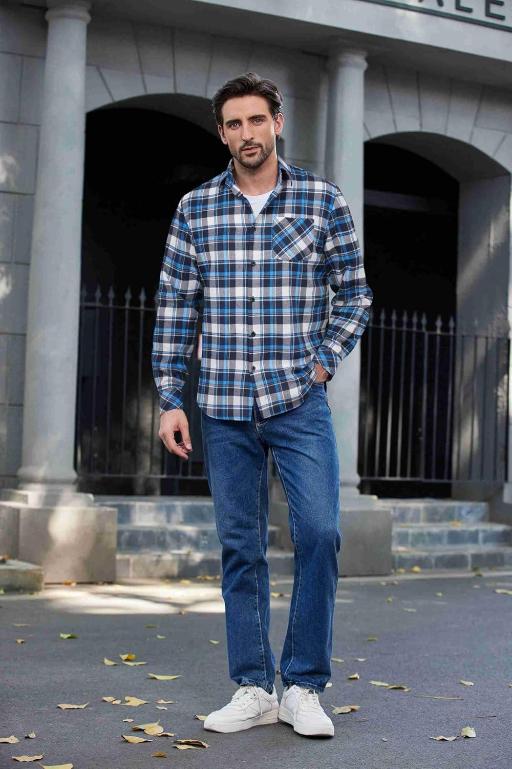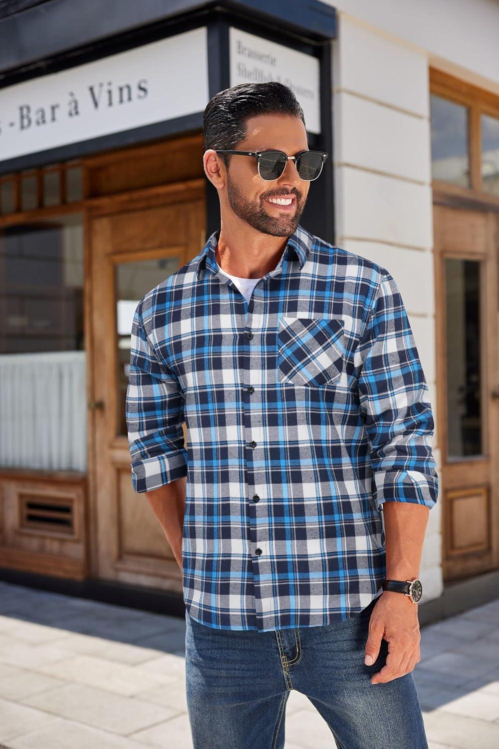 COOFANDY Men’s Flannel Shirts Long Sleeve Button Down Plaid Shirt Lightweight Shirt Jacket(Blue & Navy Blue)