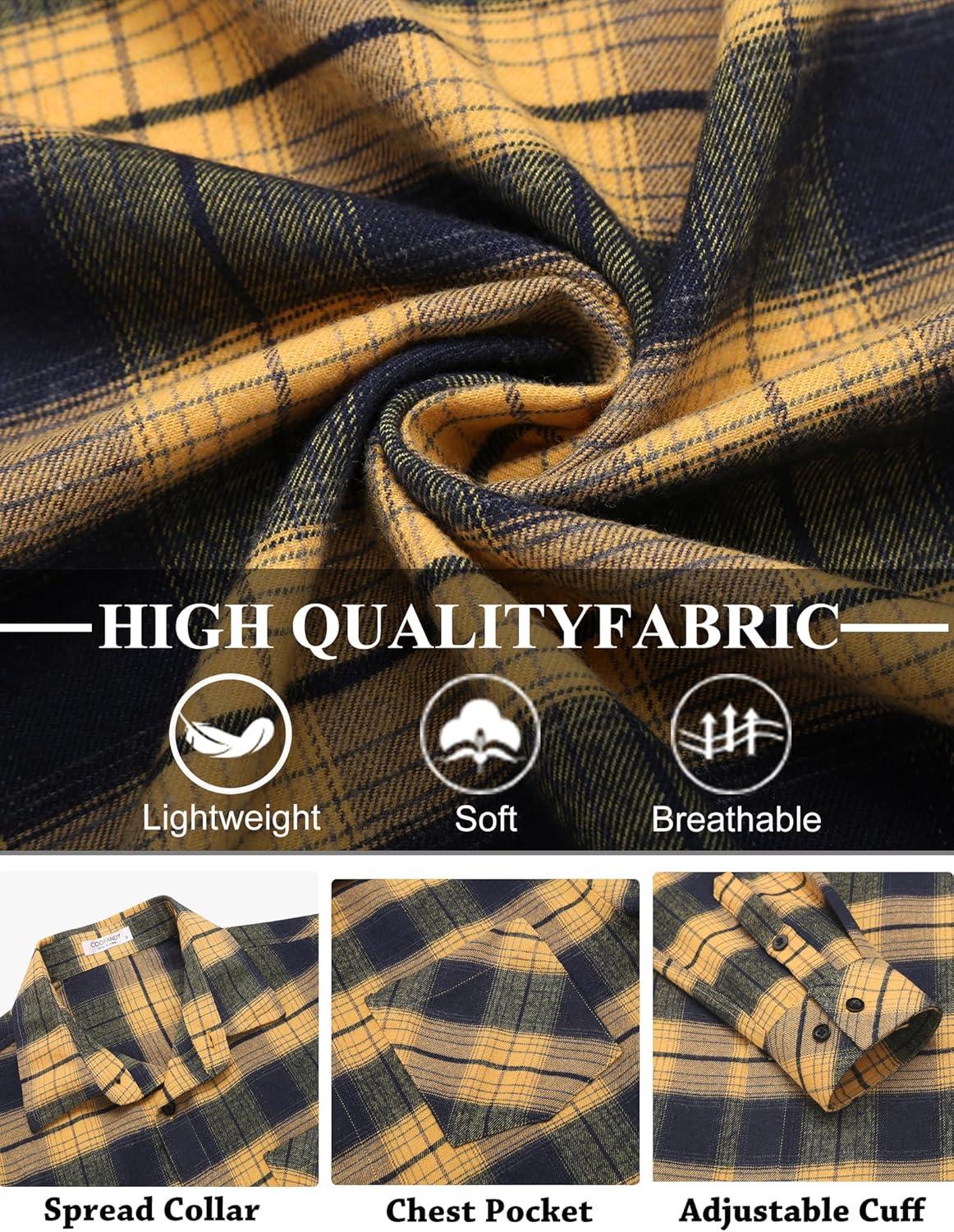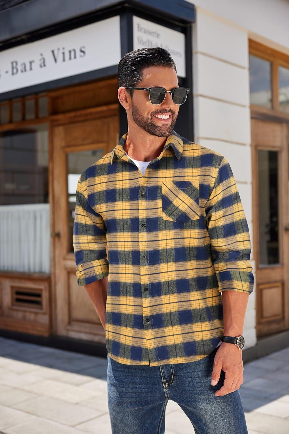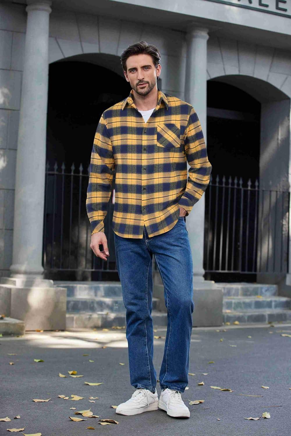 COOFANDY Men’s Flannel Shirts Long Sleeve Button Down Plaid Shirt Lightweight Shirt Jacket(Yellow-navy Blue)