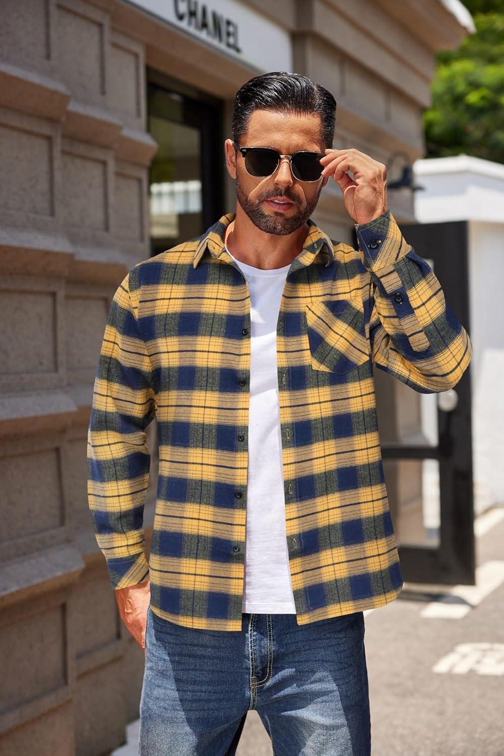 COOFANDY Men's Flannel Shirts Long Sleeve Button Down Plaid Shirt Lightweight Shirt Jacket(Yellow-navy Blue)
