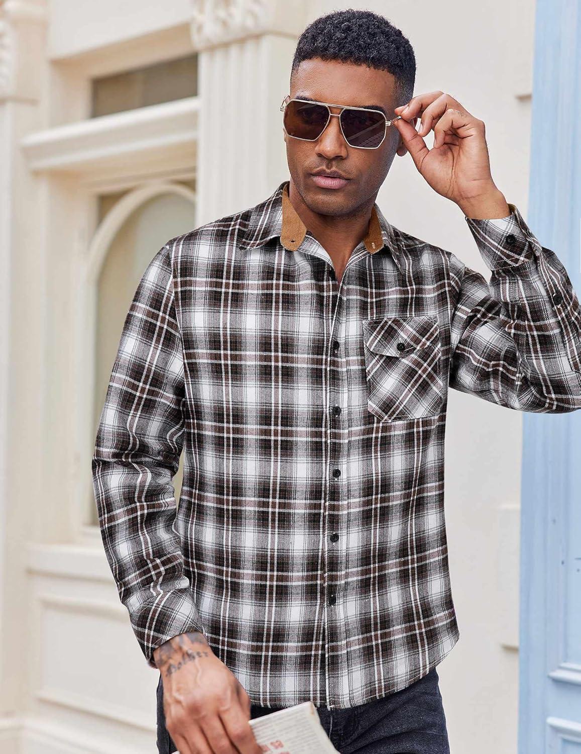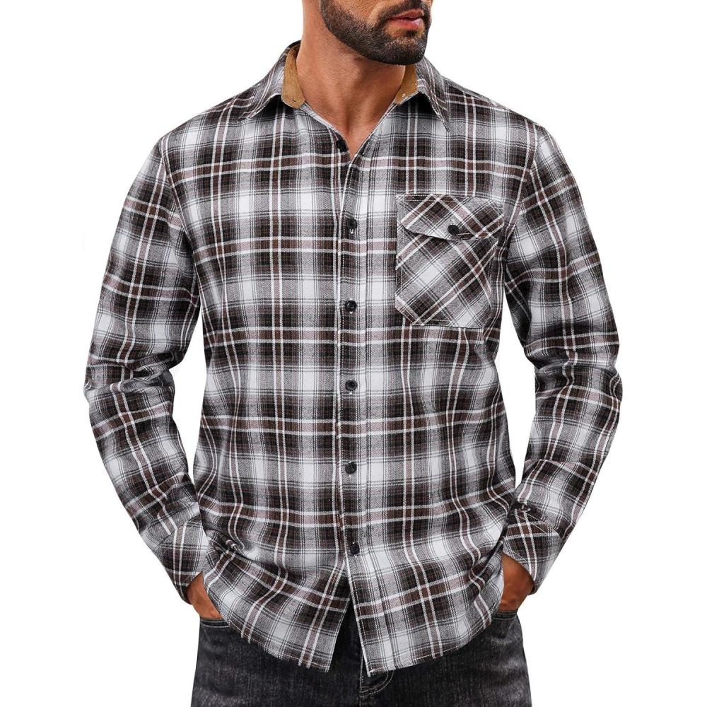 COOFANDY Mens Flannel Shirts Long Sleeve Button Down Shirt Casual Plaid Shirts with Pocket(Brown Black White Plaid)