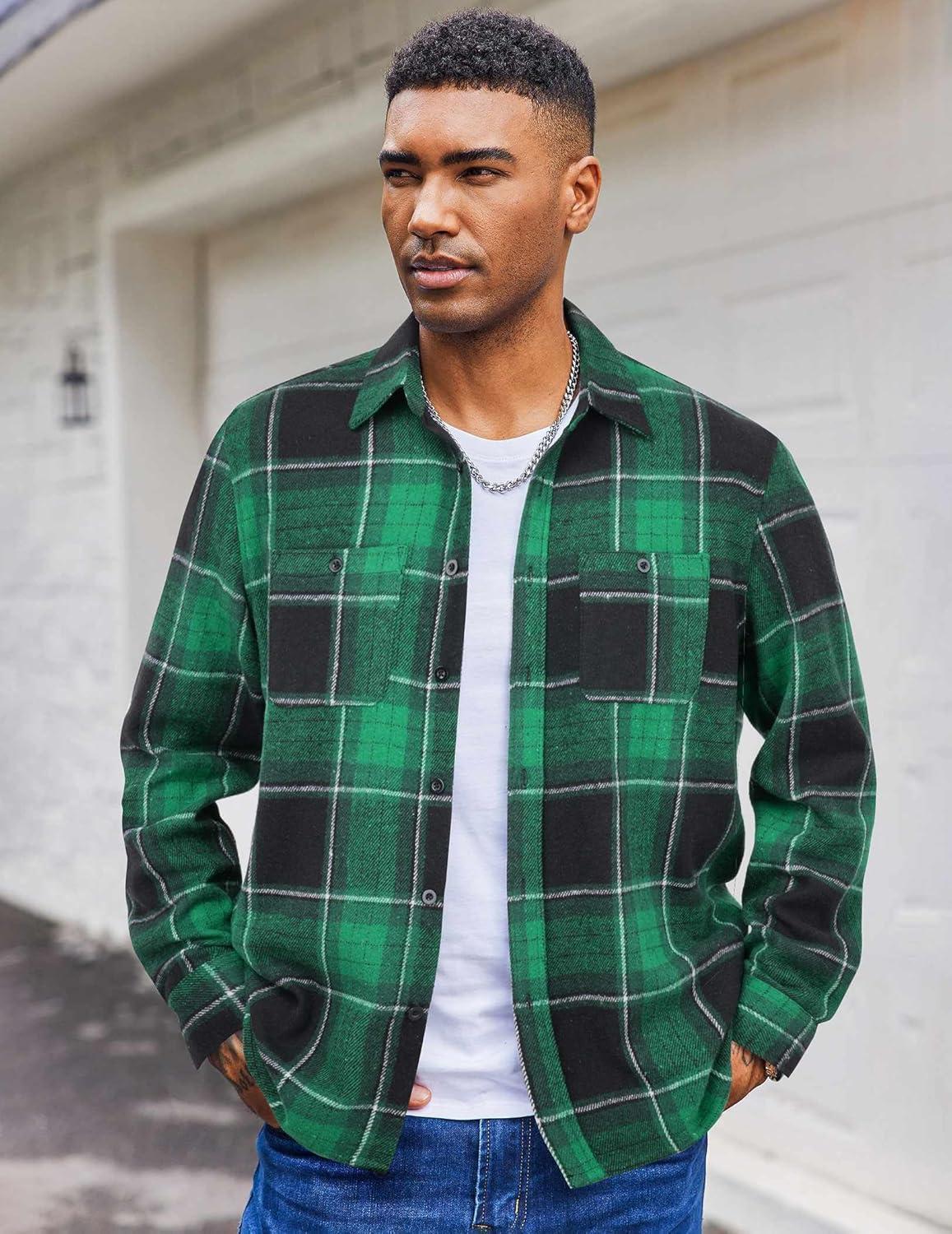 COOFANDY Men’s Flannel Shirts Long Sleeve Casual Cotton Plaid Button Down Shirt Jacket with Pockets(Green-black Plaid)