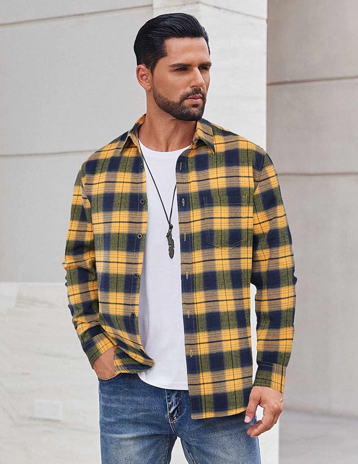 COOFANDY Mens Flannel Shirts Long Sleeve Casual Plaid Shirt for Men Button Up Shirt Jackets with Pocket(Plaid - Navy Yellow)