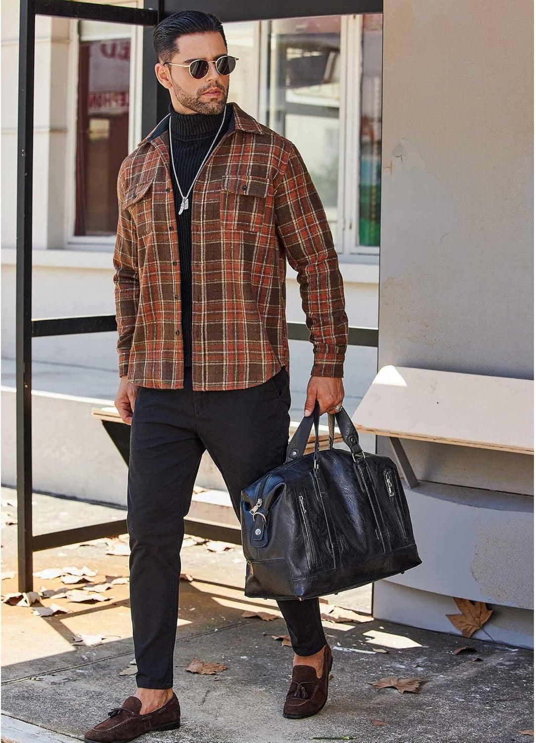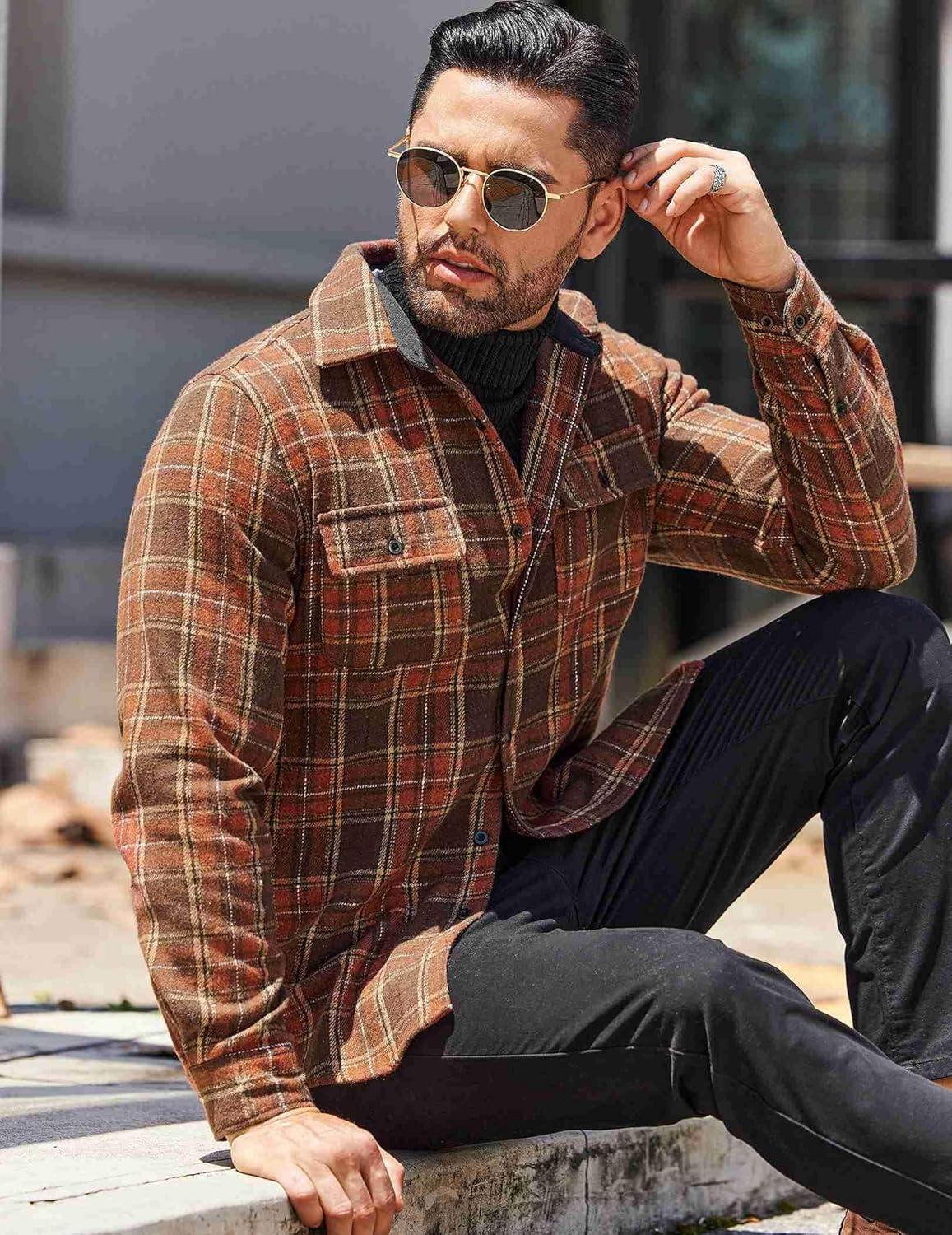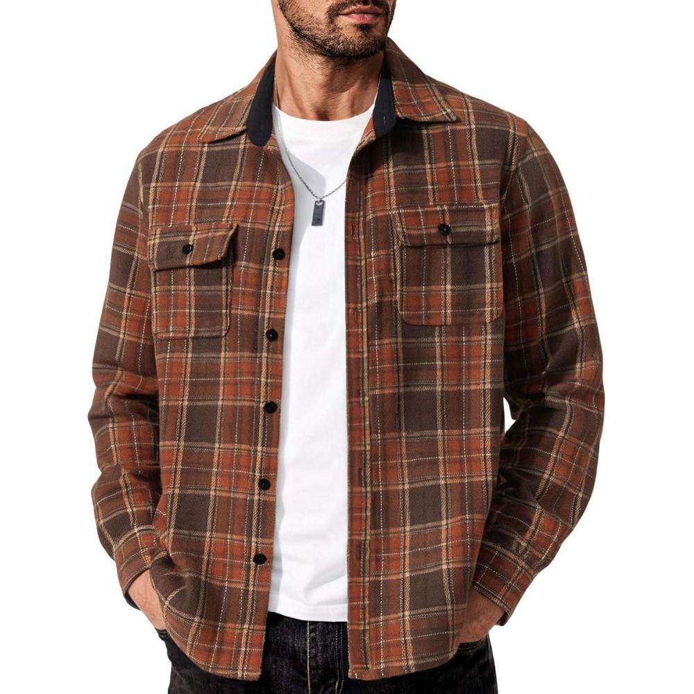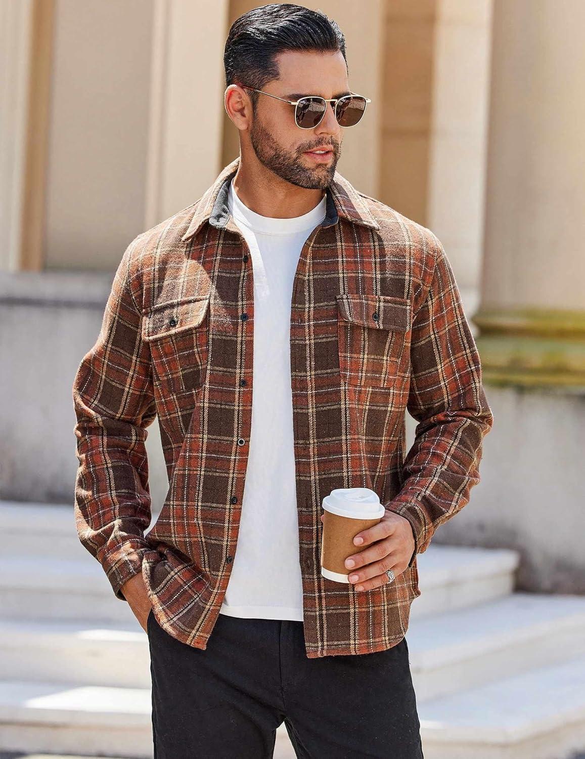 COOFANDY Men’s Flannel Shirts Long Sleeve Cotton Plaid Shirt Jacket Casual Button Down Shirt with Pockets(Brown)