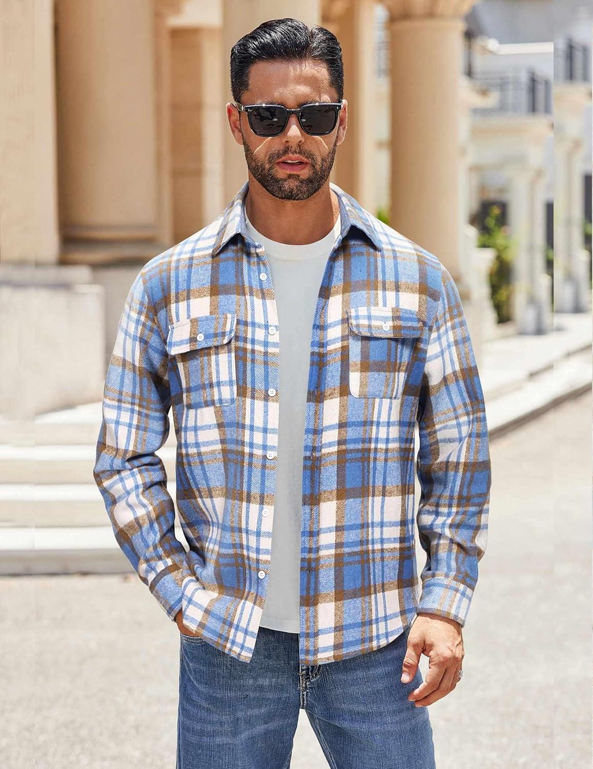 COOFANDY Men's Flannel Shirts Long Sleeve Cotton Plaid Shirt Jacket Casual Button Down Shirt with Pockets(Light Blue)