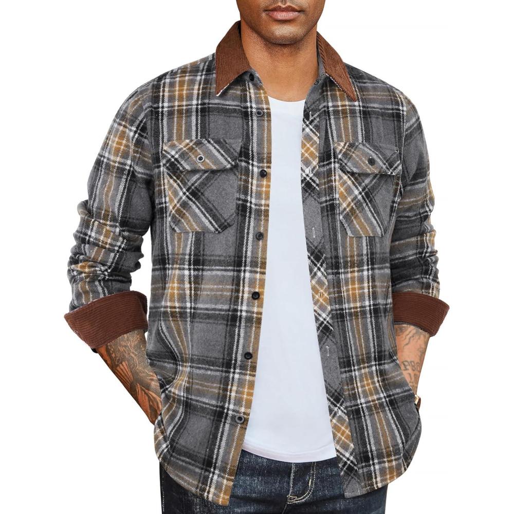 COOFANDY Mens Flannel Shirts Long Sleeve Fleece Plaid Jacket Casual Stylish Button Down Shirts with Pockets(Grey)