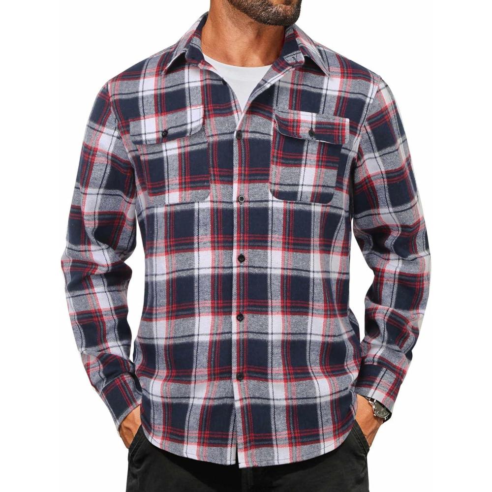 COOFANDY Mens Flannel Shirts Long Sleeve Plaid Button Down Shirt Cotton Casual Work Shirts with Pockets(Navy Red White)