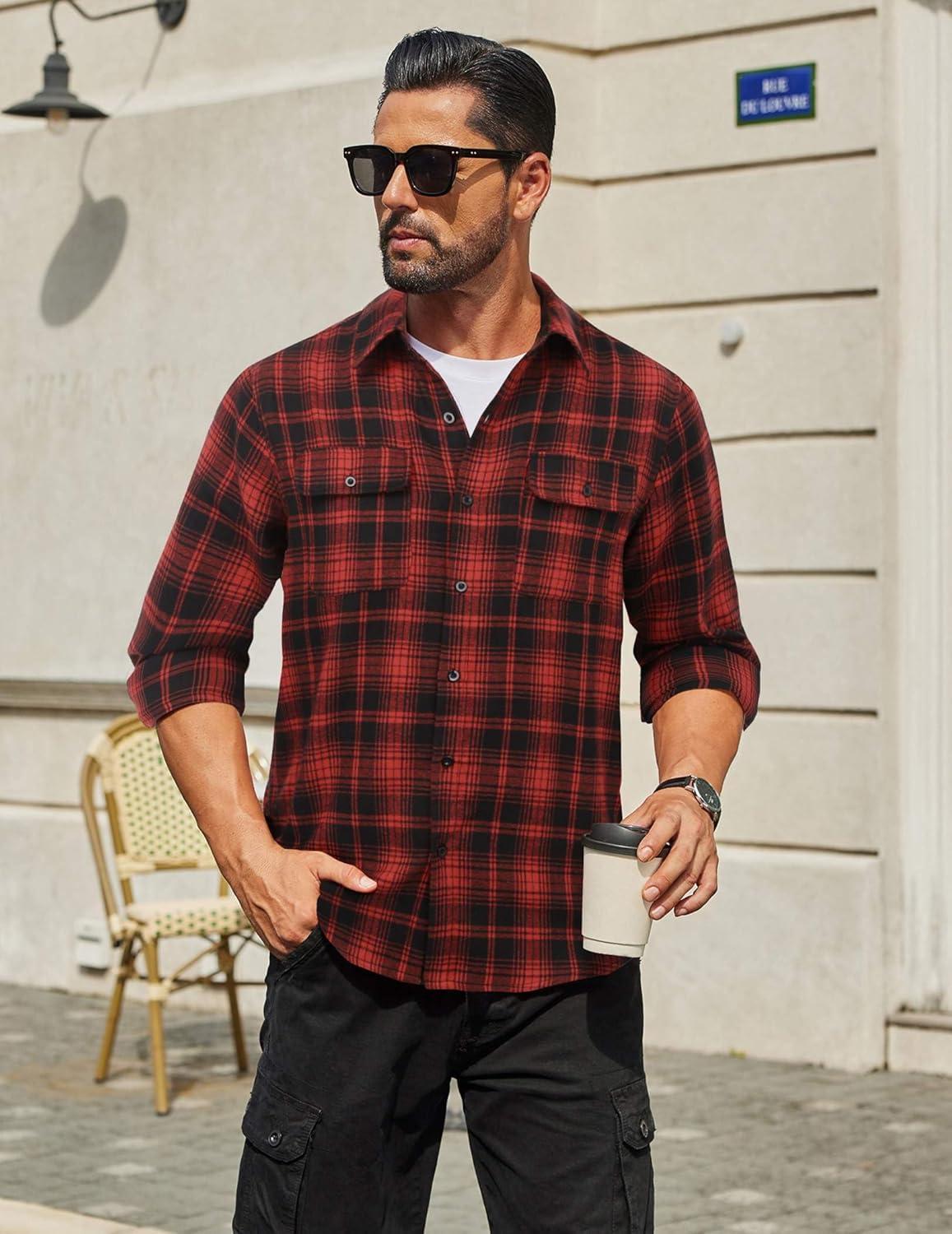 COOFANDY Mens Flannel Shirts Long Sleeve Plaid Button Down Shirt Cotton Casual Work Shirts with Pockets(Red Black)