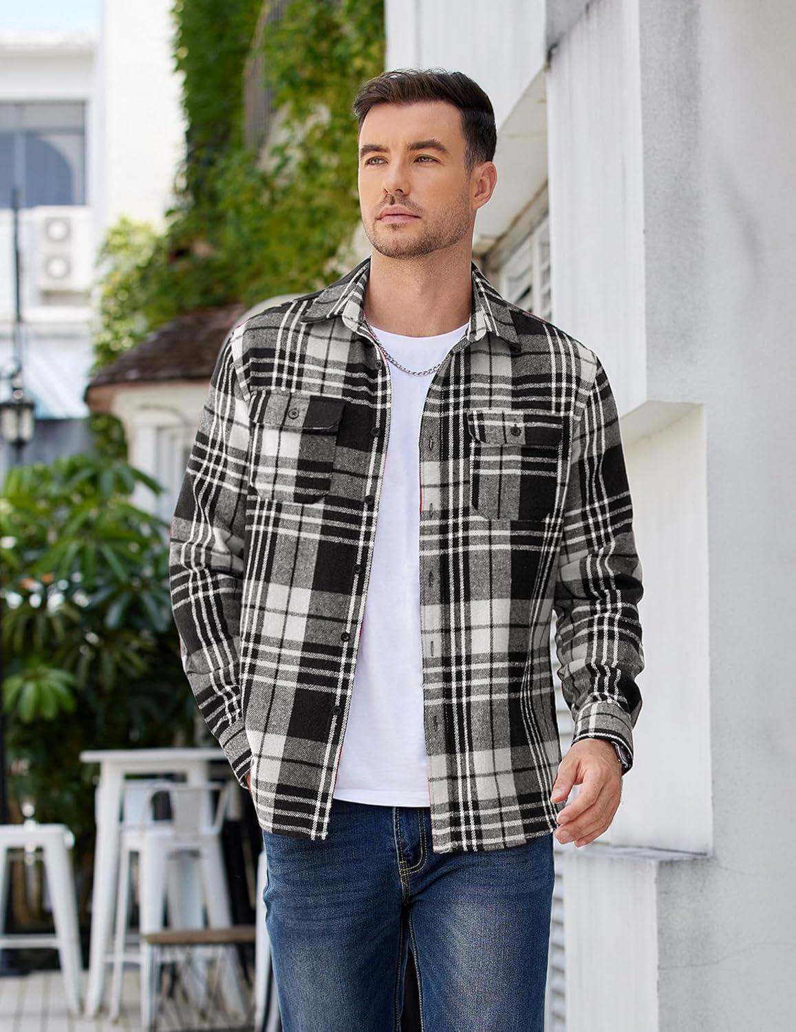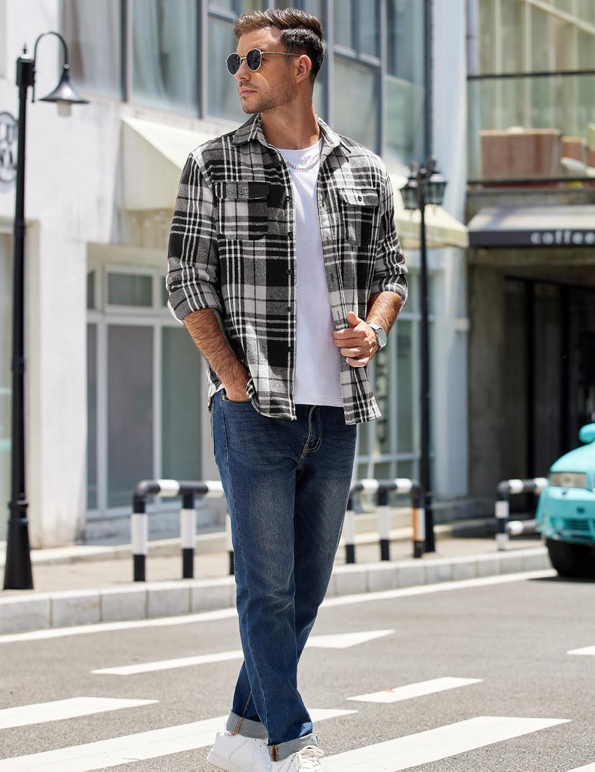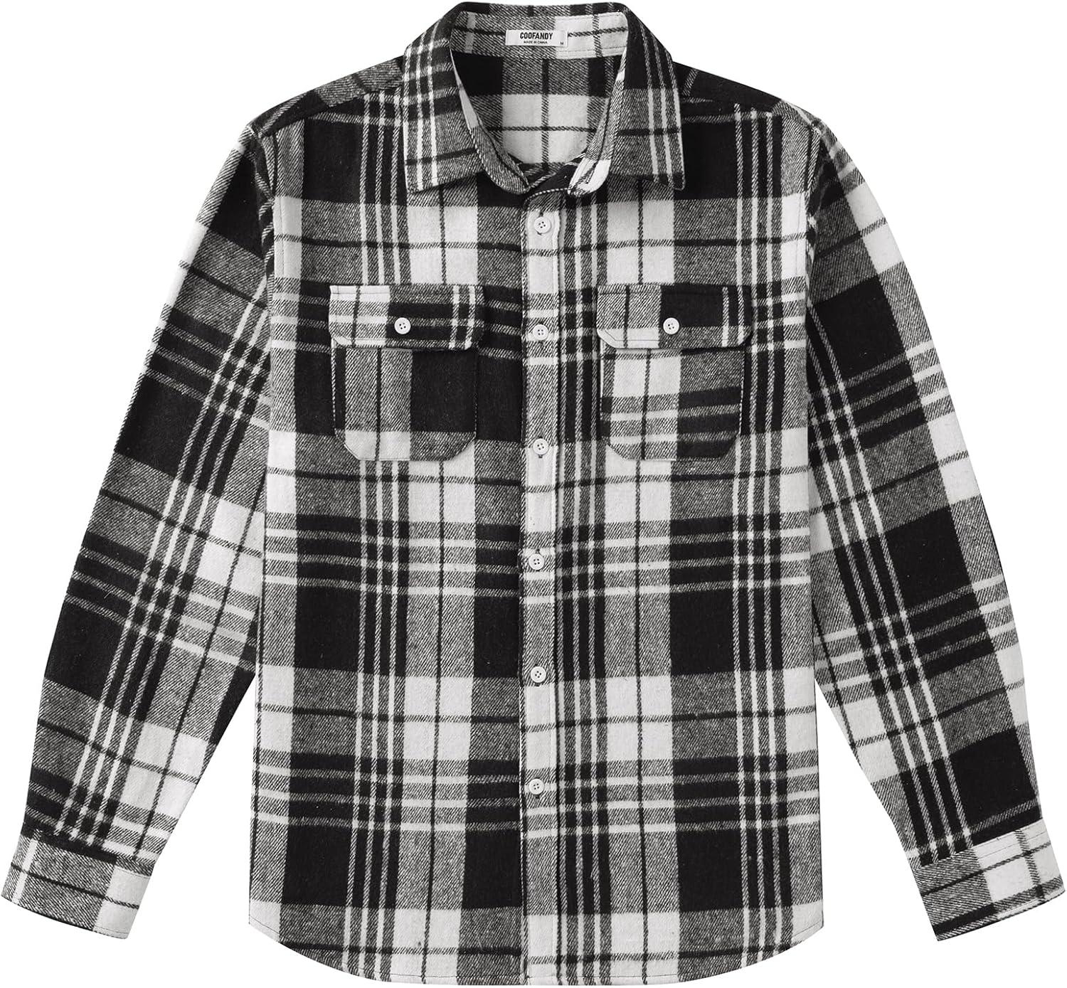 COOFANDY Mens Flannel Shirts Long Sleeve Plaid Shirt Jacket Button Down Shirt with Pockets(Black White)