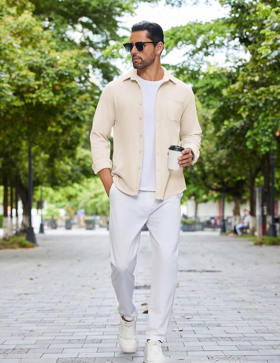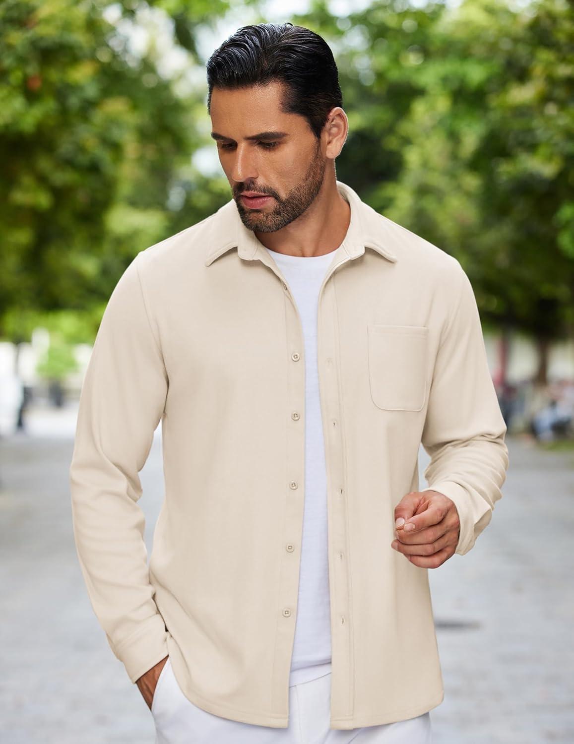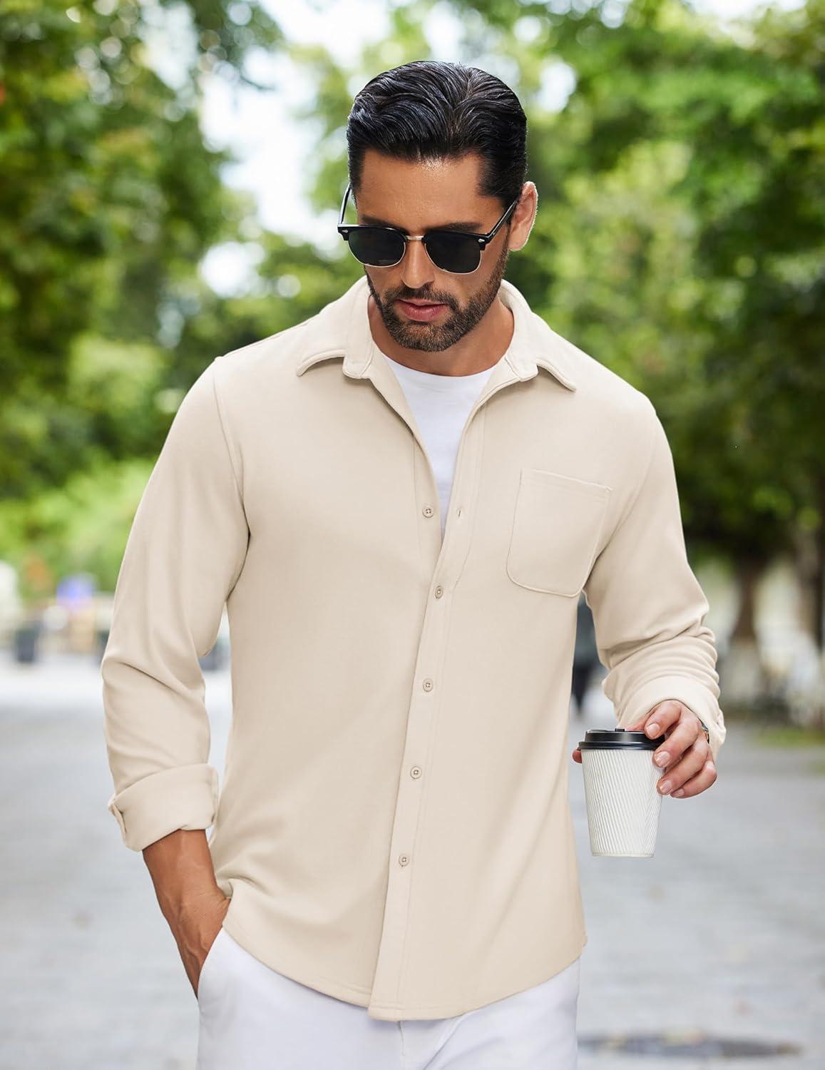 COOFANDY Mens Flannel Shirts Long Sleeve Thermal Button Down Shirt Shacket Lightweight Jacket(Beige)