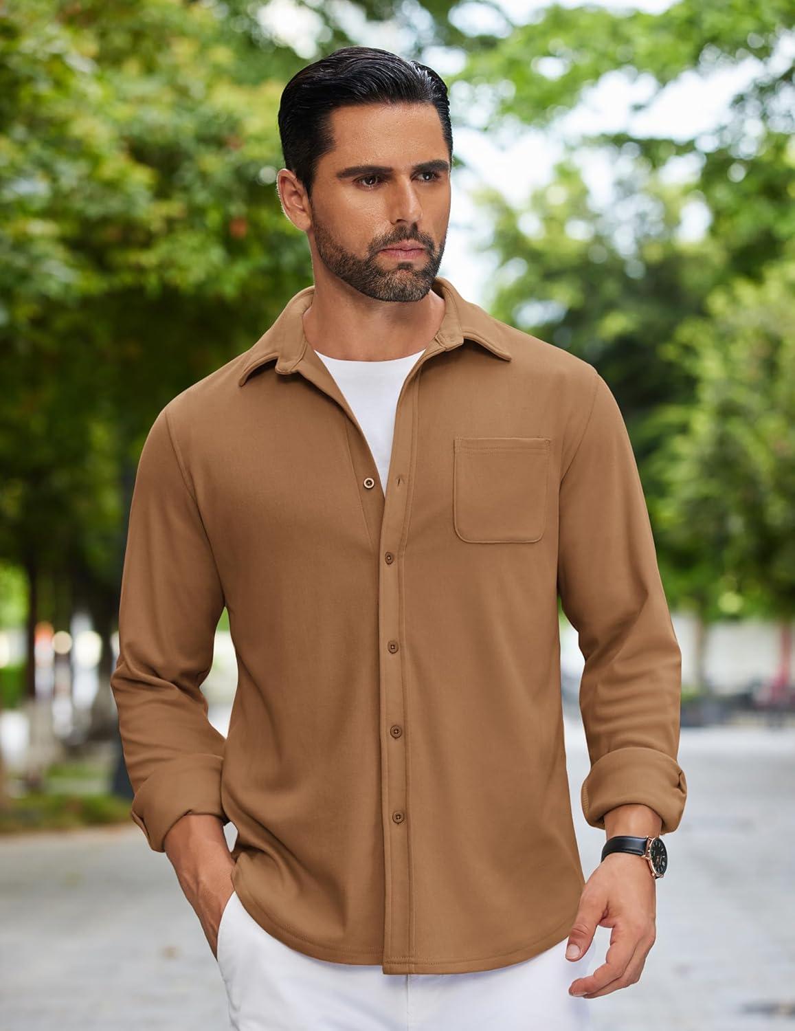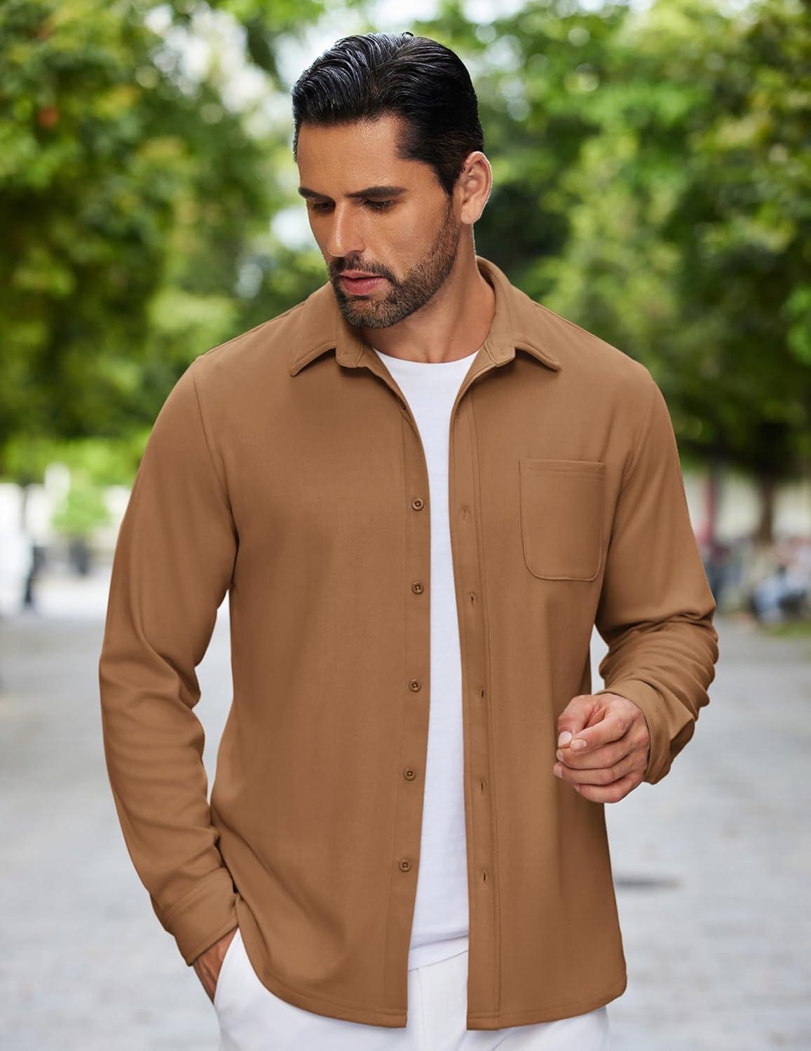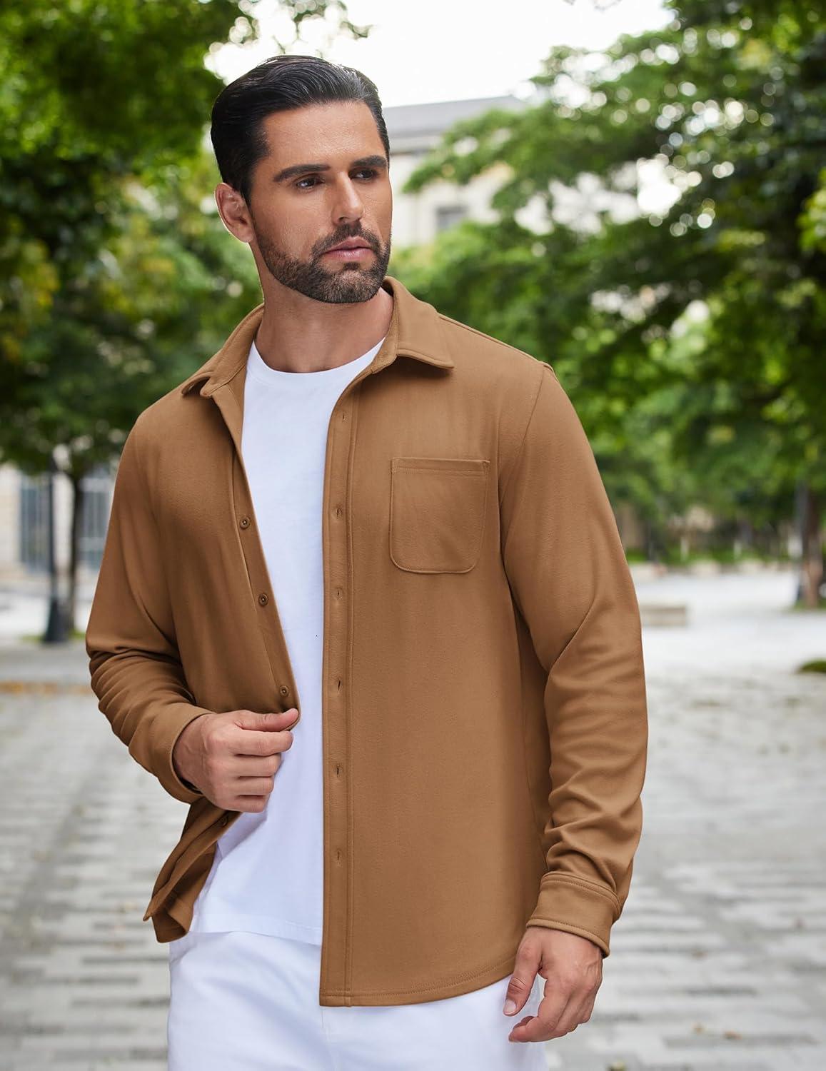 COOFANDY Mens Flannel Shirts Long Sleeve Thermal Button Down Shirt Shacket Lightweight Jacket(Brown)