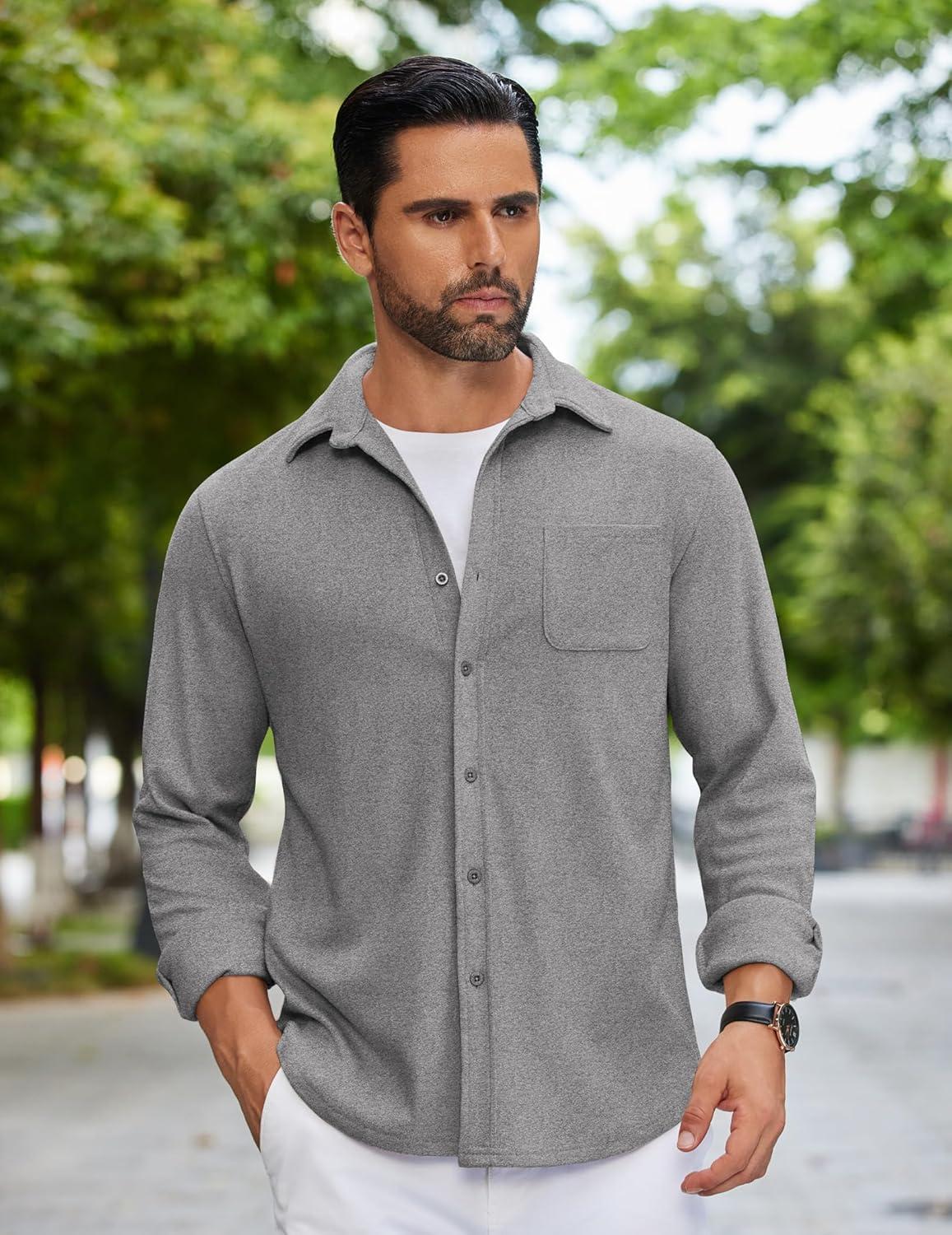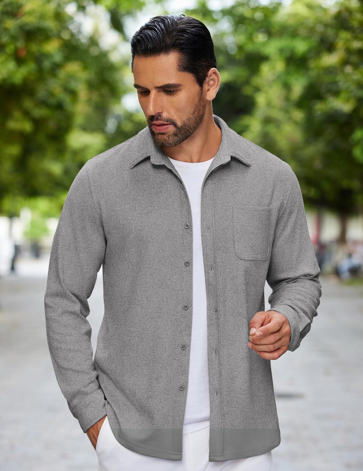 COOFANDY Mens Flannel Shirts Long Sleeve Thermal Button Down Shirt Shacket Lightweight Jacket(Light Grey)