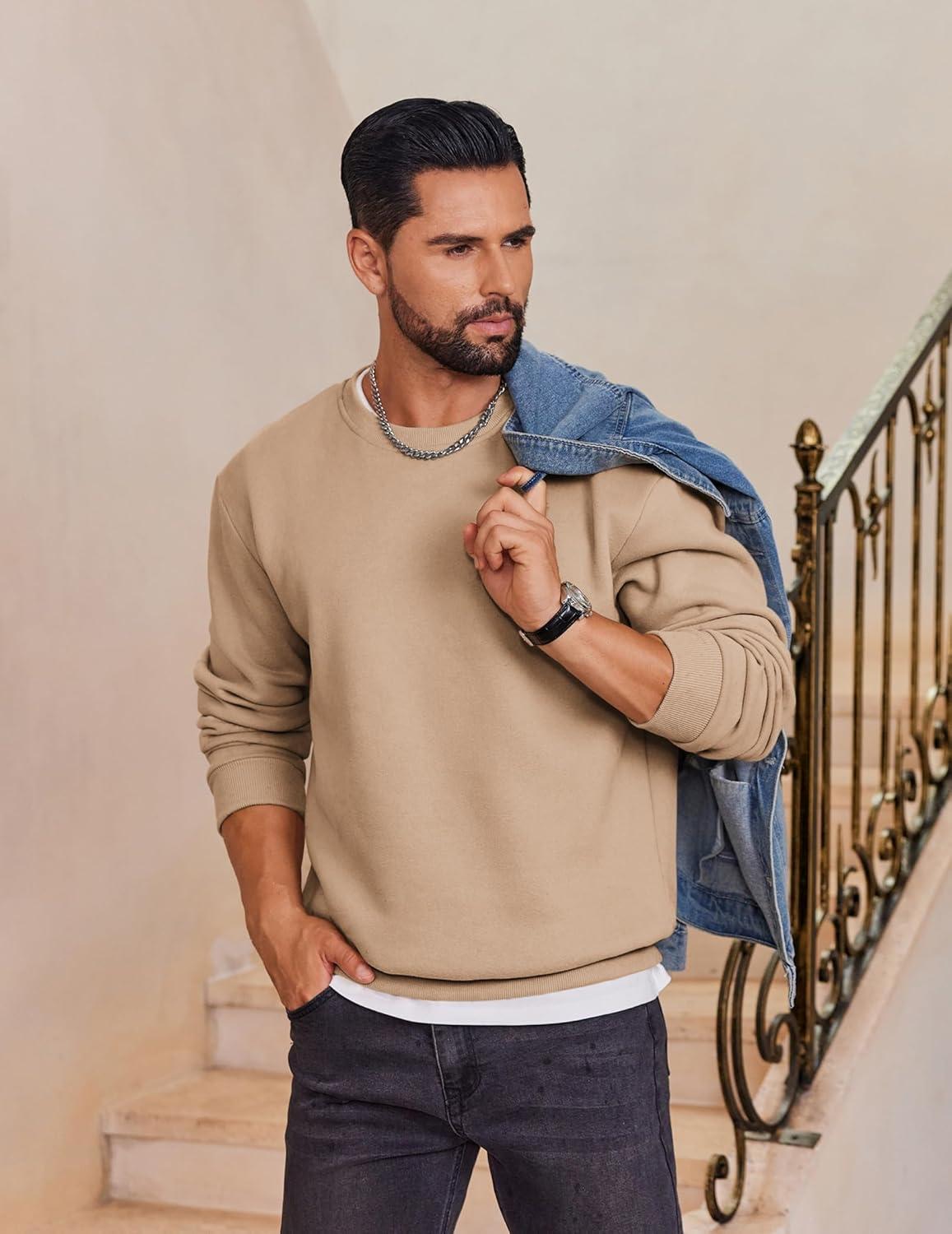 COOFANDY Men’s Fleece Crewneck Sweatshirt Cotton Long Sleeve Pullover Casual Thermal Shirts(Khaki)