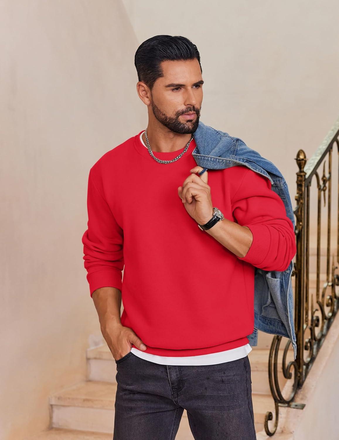 COOFANDY Men’s Fleece Crewneck Sweatshirt Cotton Long Sleeve Pullover Casual Thermal Shirts(Red)