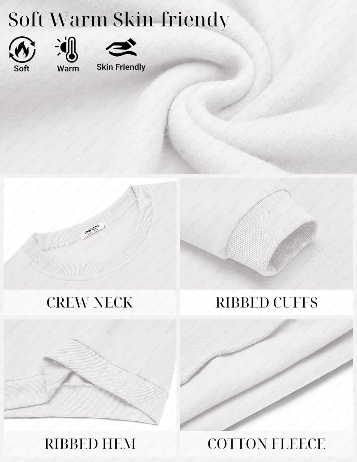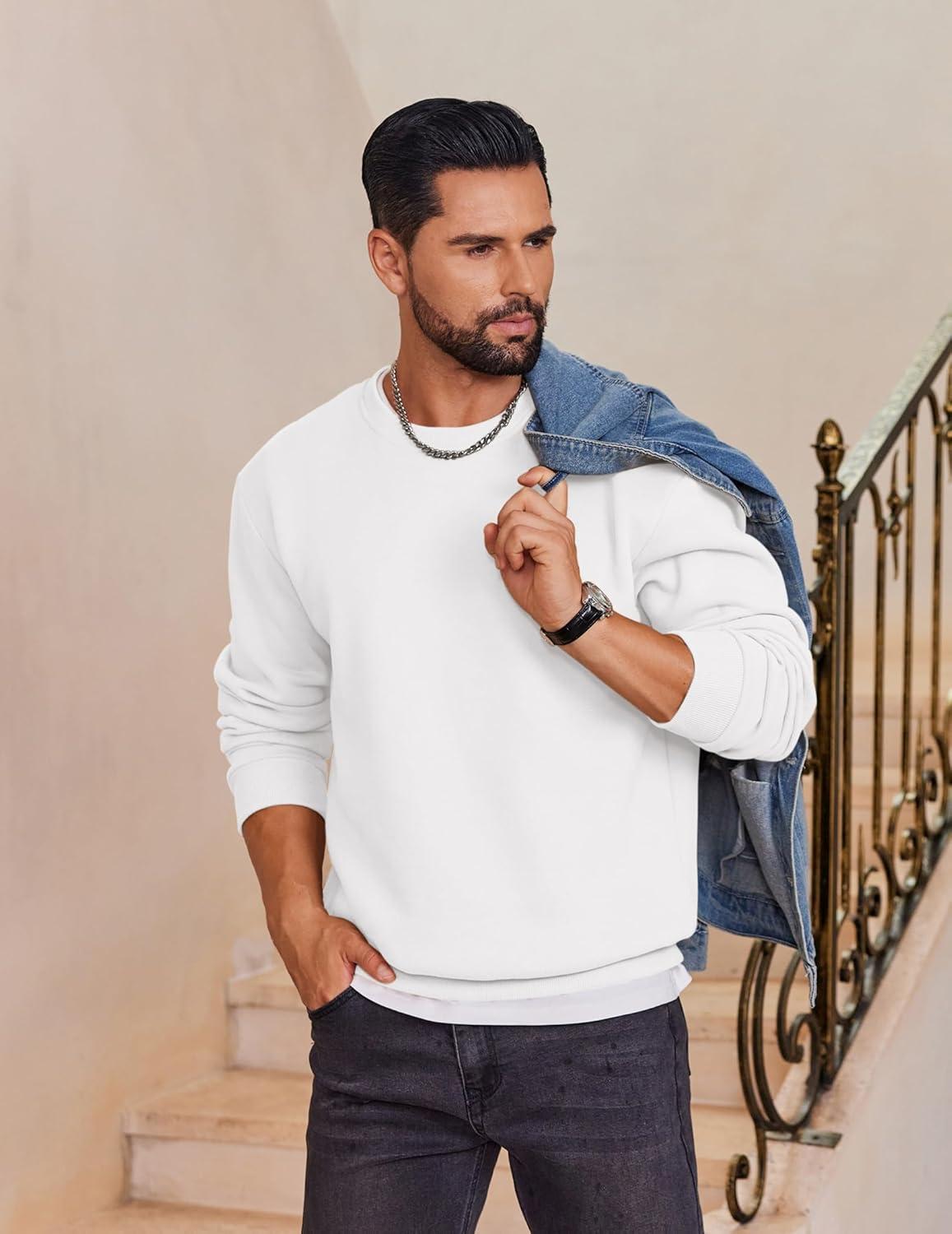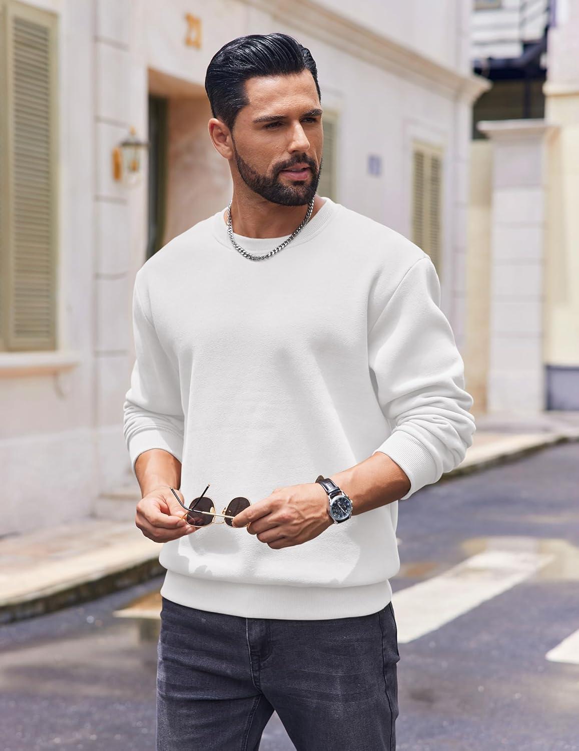 COOFANDY Men’s Fleece Crewneck Sweatshirt Cotton Long Sleeve Pullover Casual Thermal Shirts(White)