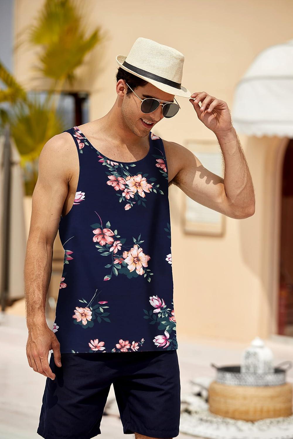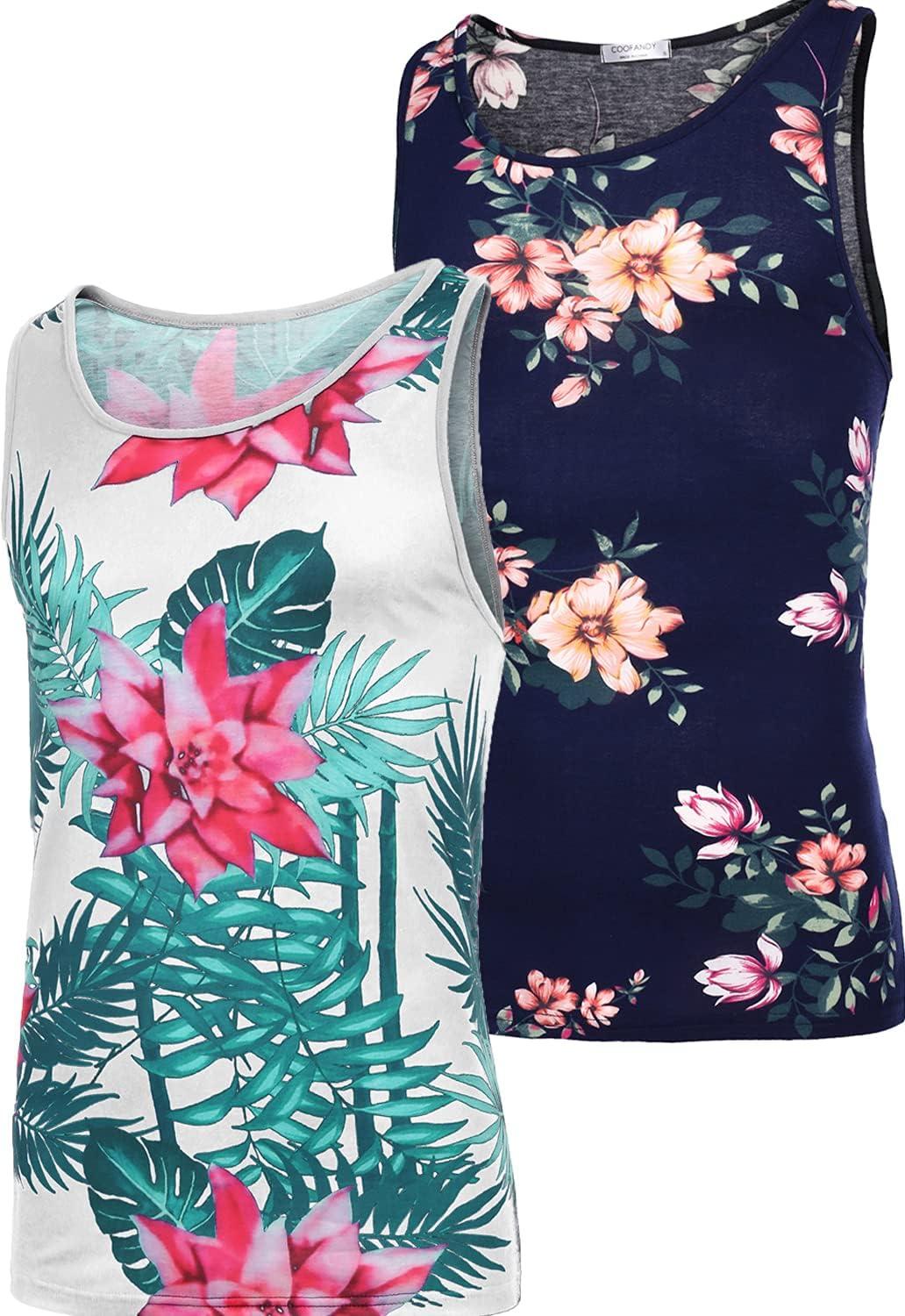COOFANDY Men’s Floral Tank Top Sleeveless Tees All Over Print Casual Sport T-Shirts Hawaii Beach Vacation(2 Pack-black/White)