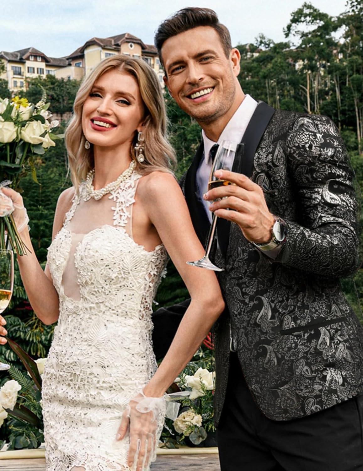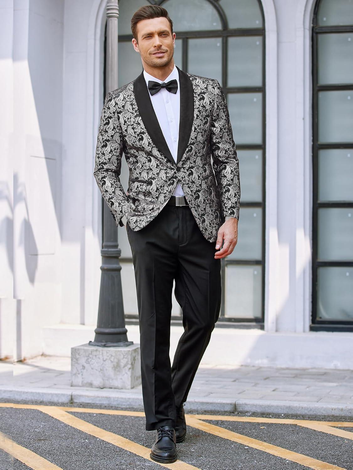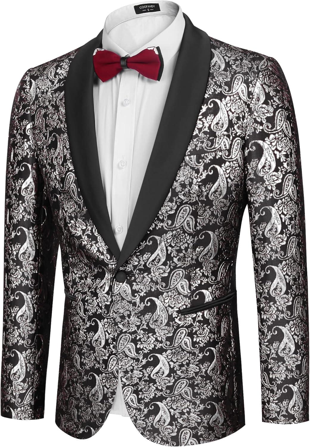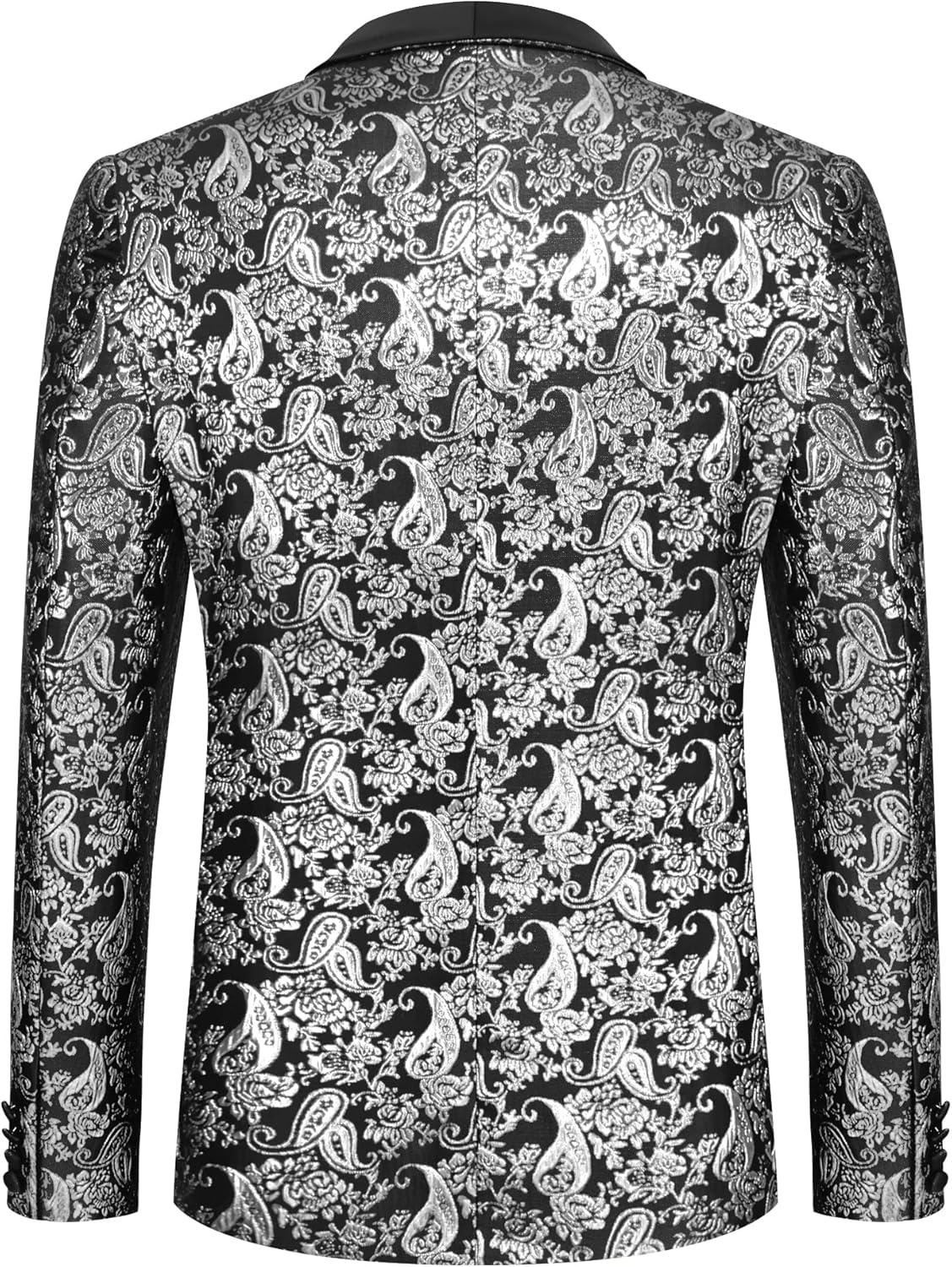 COOFANDY Men's Floral Tuxedo Jacket Jacquard Suit Jacket Slim Fit Blazer for Wedding, Prom, Dinner(Type02-silver)