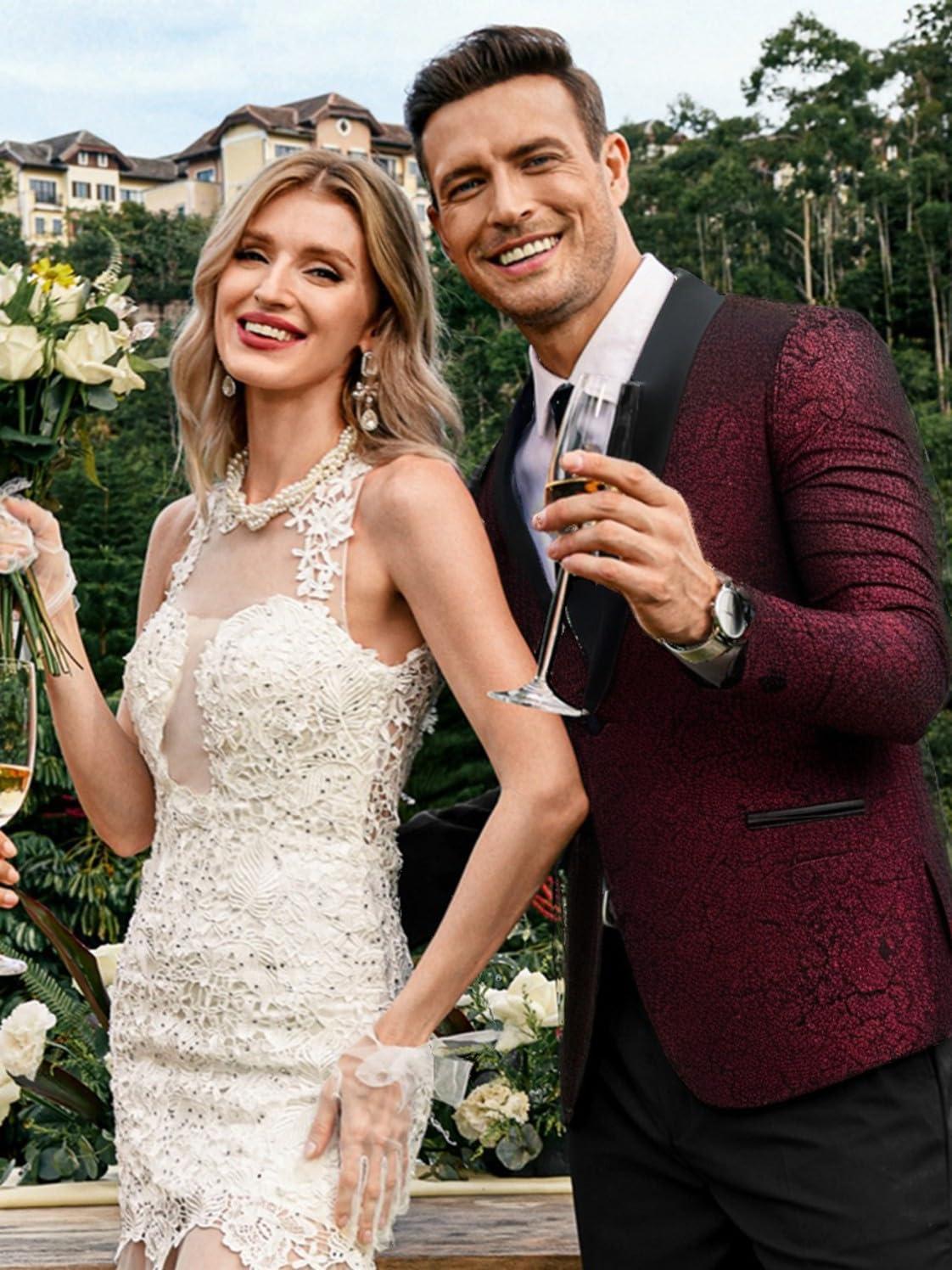 imageCOOFANDY Mens Floral Tuxedo Jacket Jacquard Suit Jacket Slim Fit Blazer for Wedding Prom DinnerWine Red