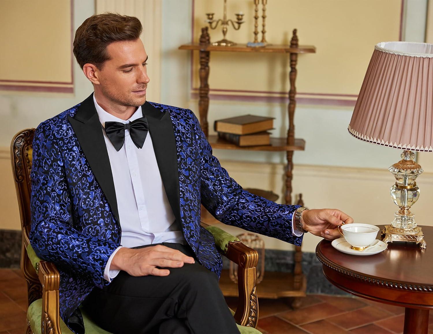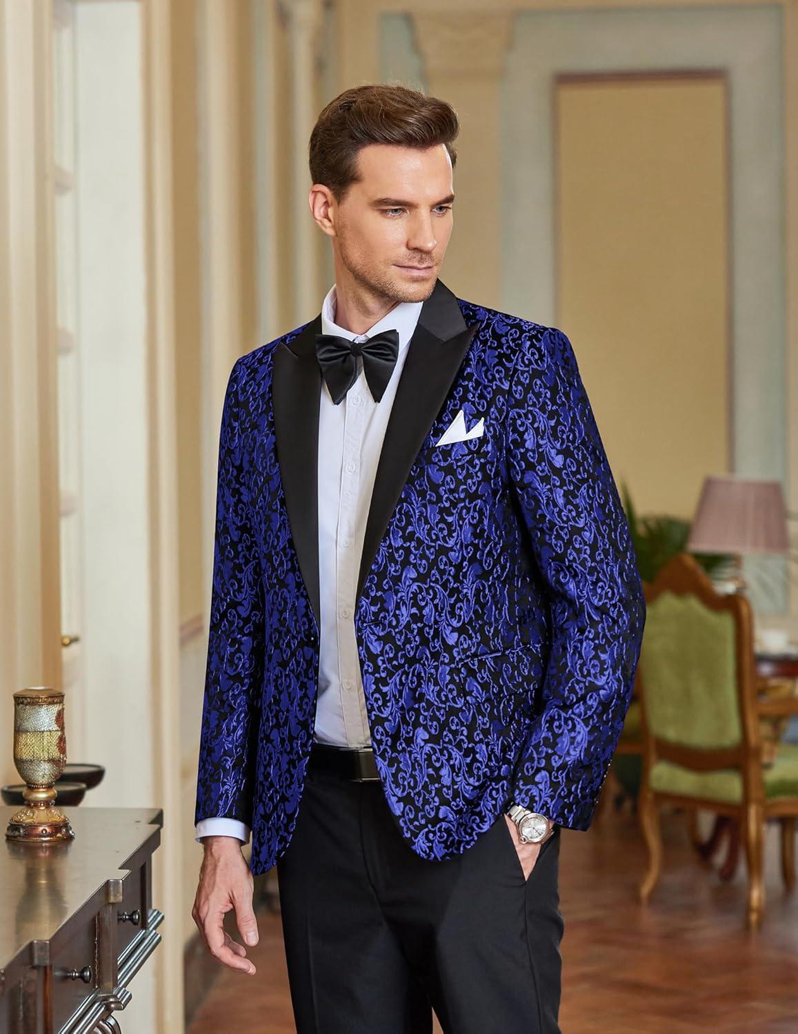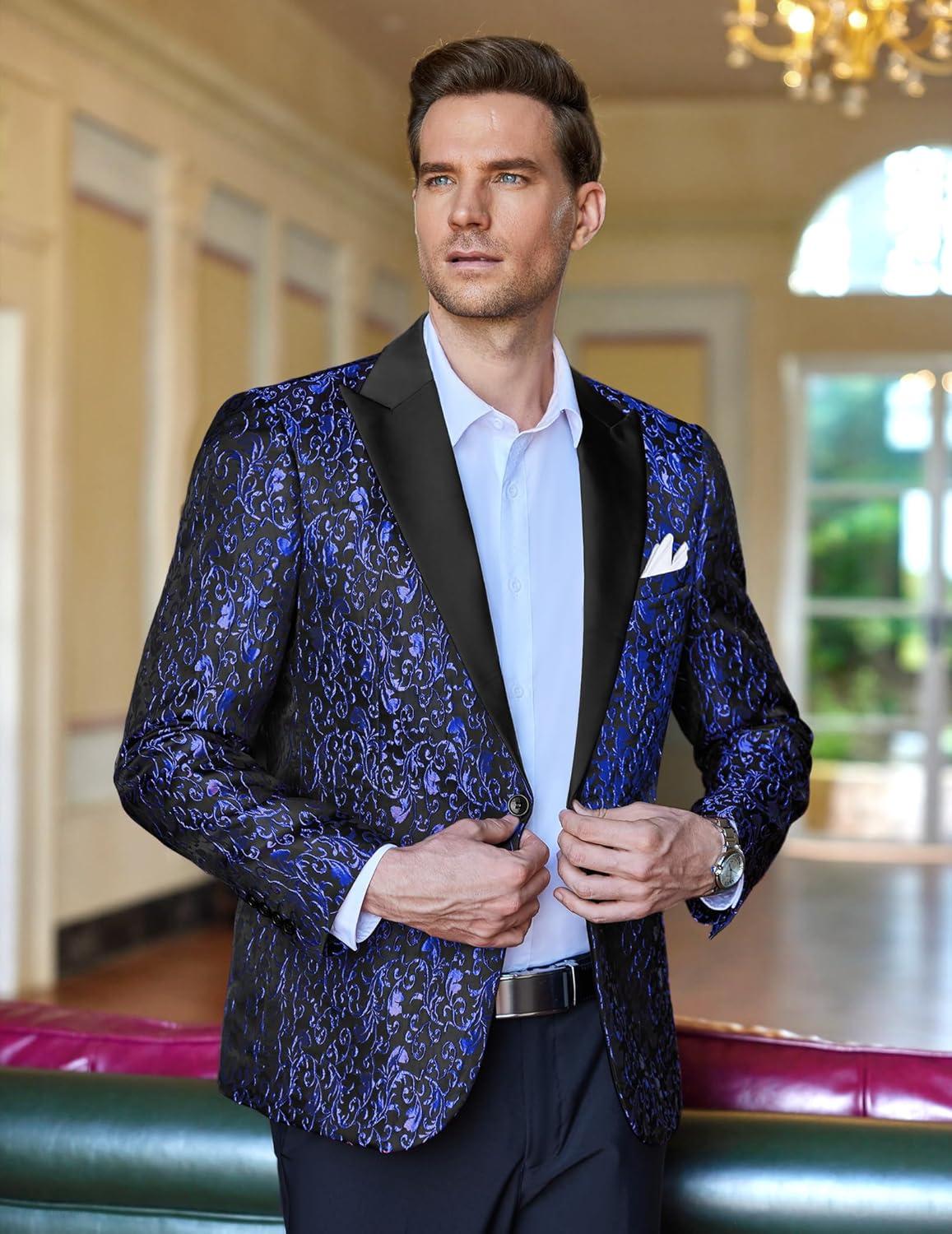 COOFANDY Mens Floral Tuxedo One Button Luxury Shiny Blazer Dinner Party Prom Wedding Suit Jacket(1 - Blue)