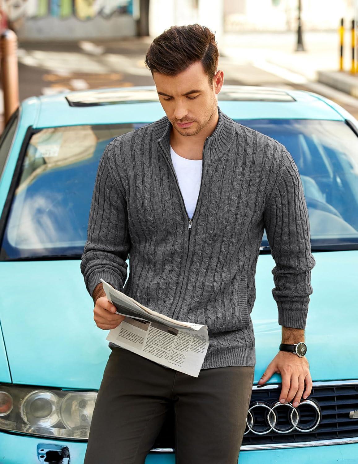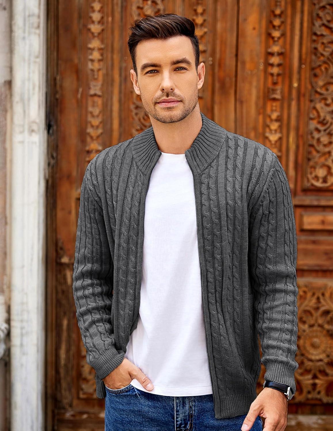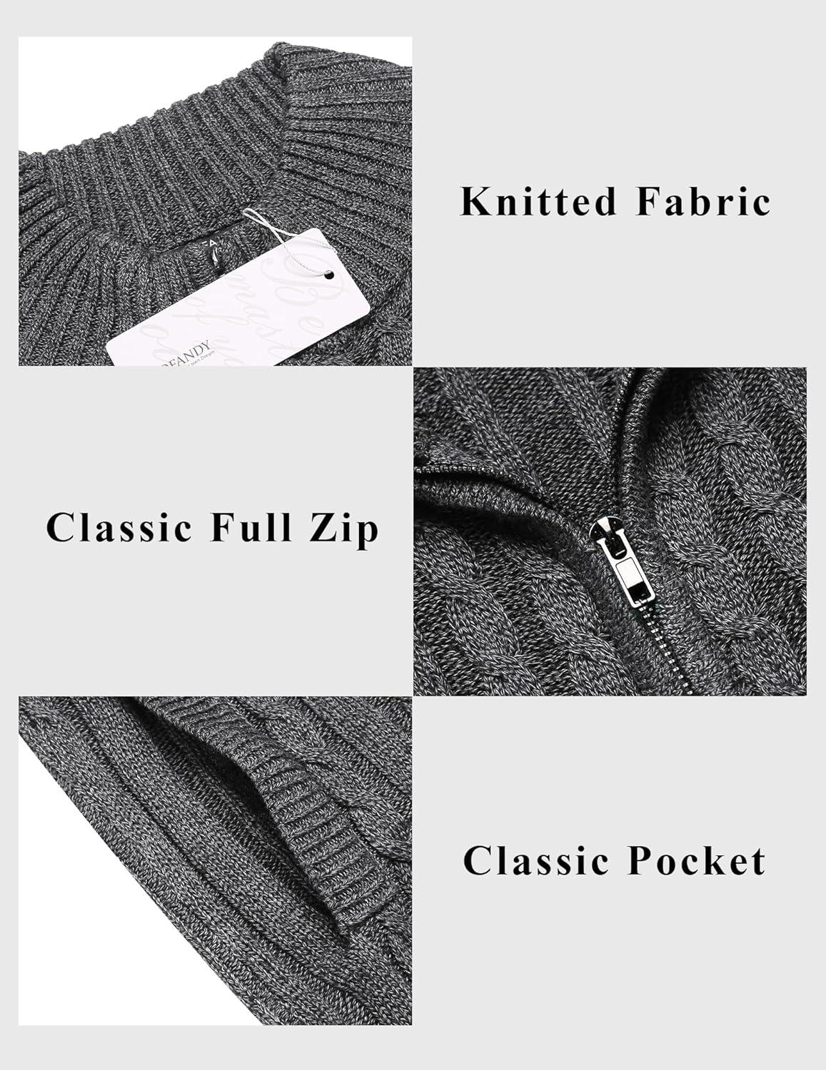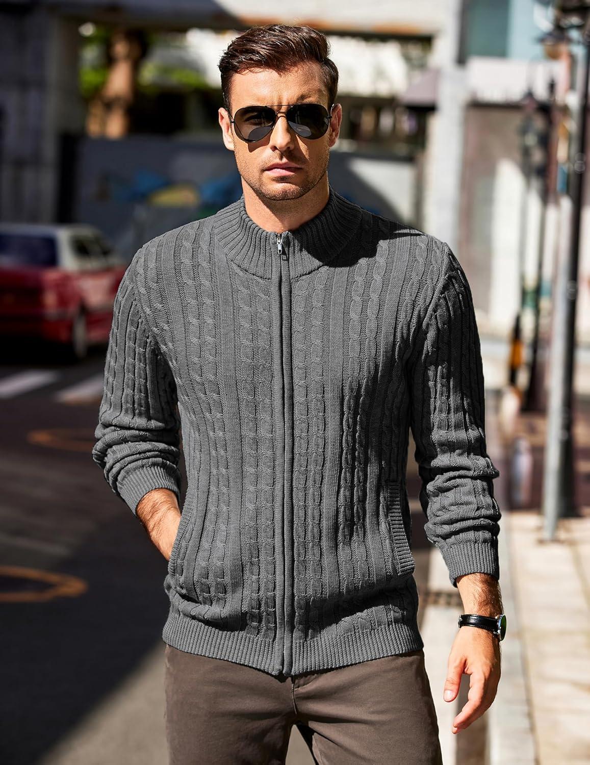 COOFANDY Men's Full Zip Cardigan Sweater Slim Fit Cable Knitted Zip Up Sweater with Pockets(Heathered Black)